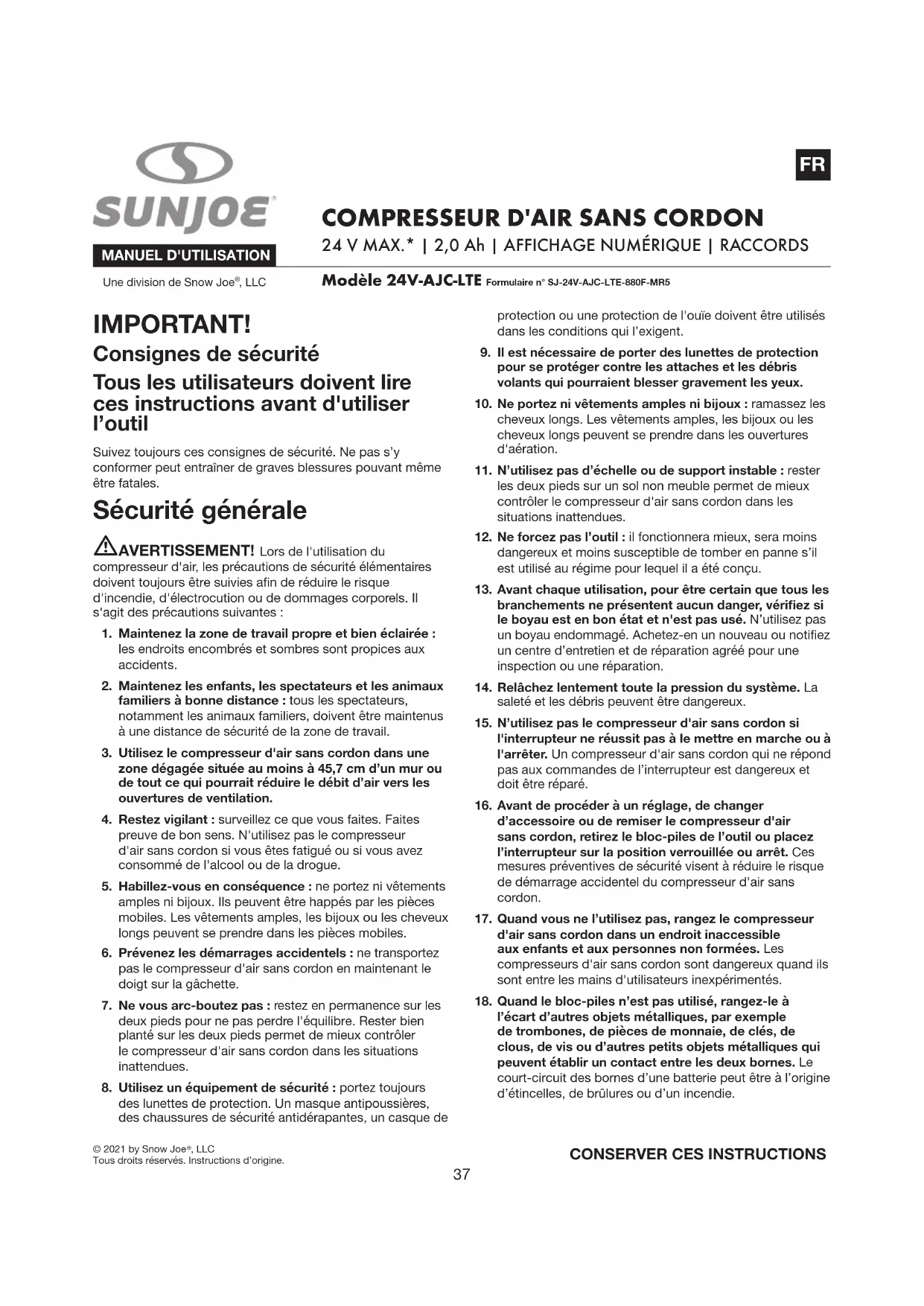 24VAJCLTE - Compresseur Sun Joe - Notice d'utilisation et mode d'emploi gratuit