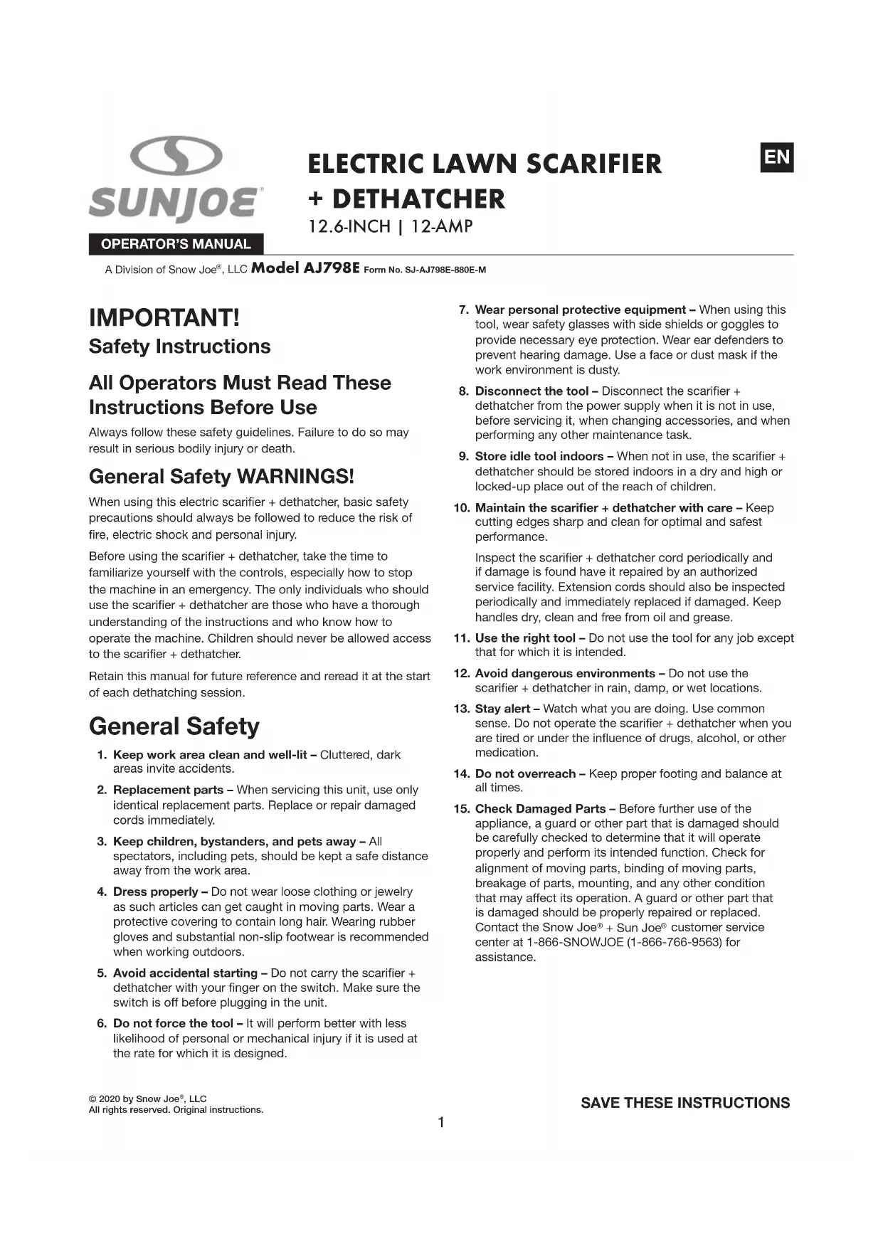 Retrouvez gratuitement la notice de l'appareil AJ798E Sun Joe au format PDF.