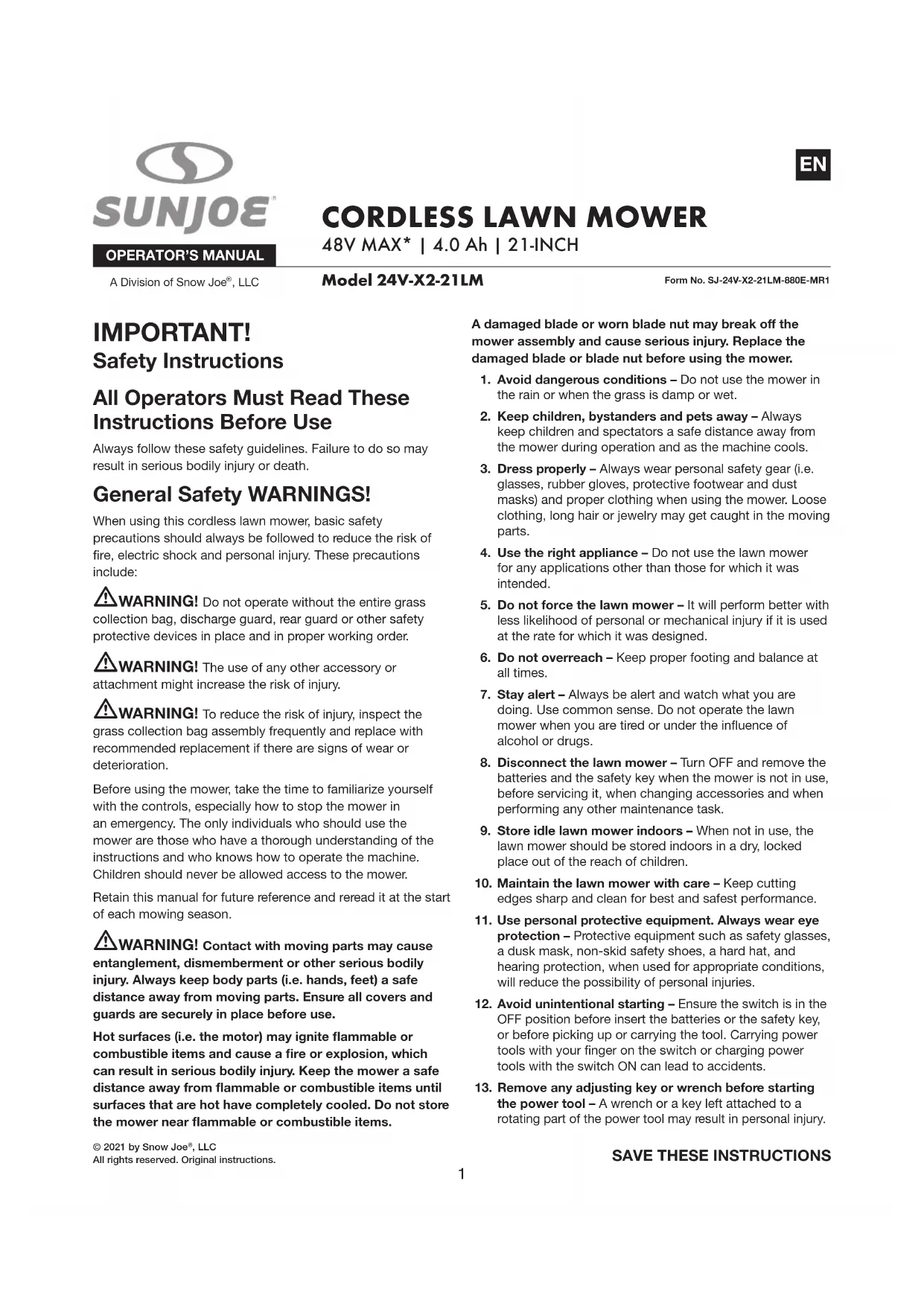 24VX221LMSPCT - Tondeuse à gazon Sun Joe - Notice d'utilisation et mode d'emploi gratuit