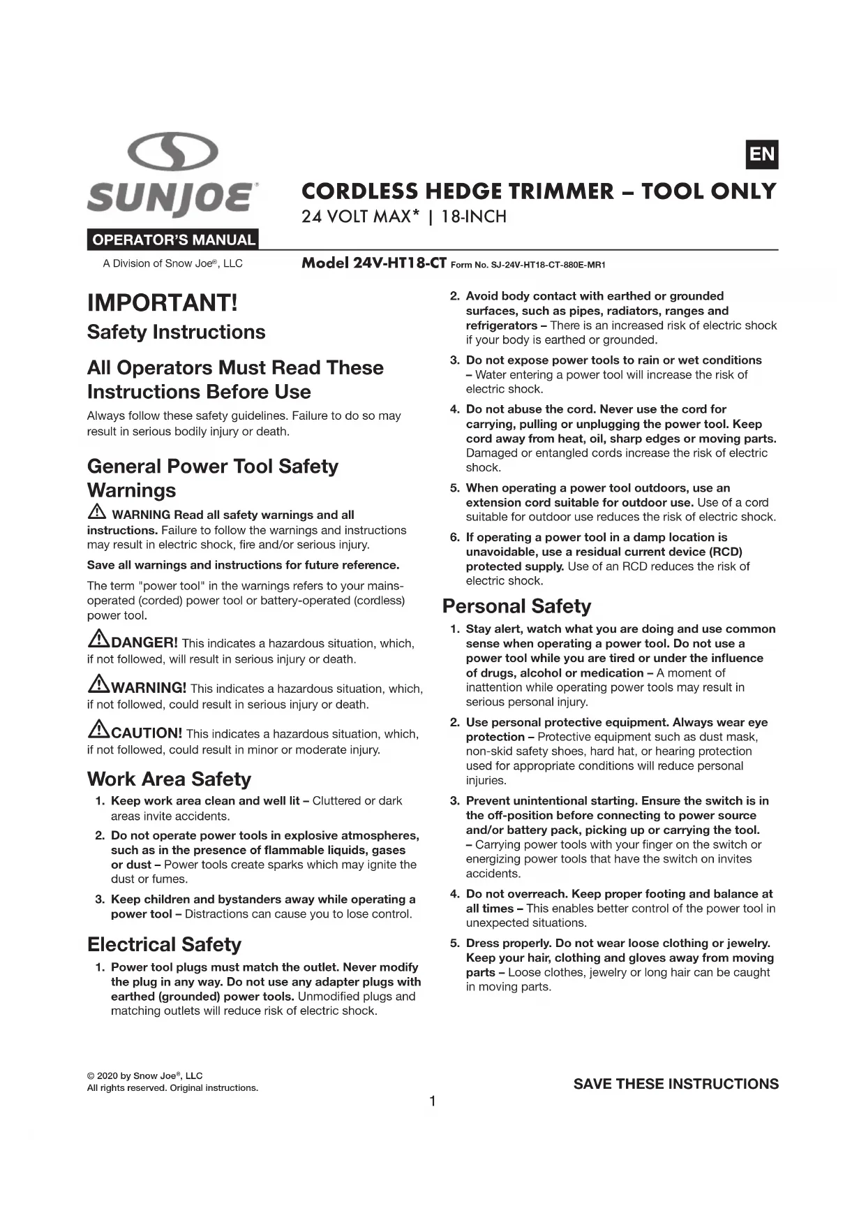 24VHT18CT - Taille-haies Sun Joe - Notice d'utilisation et mode d'emploi gratuit