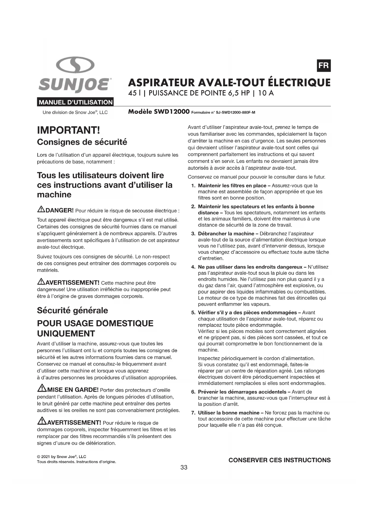 SWD12000 - Aspirateur Sun Joe - Notice d'utilisation et mode d'emploi gratuit