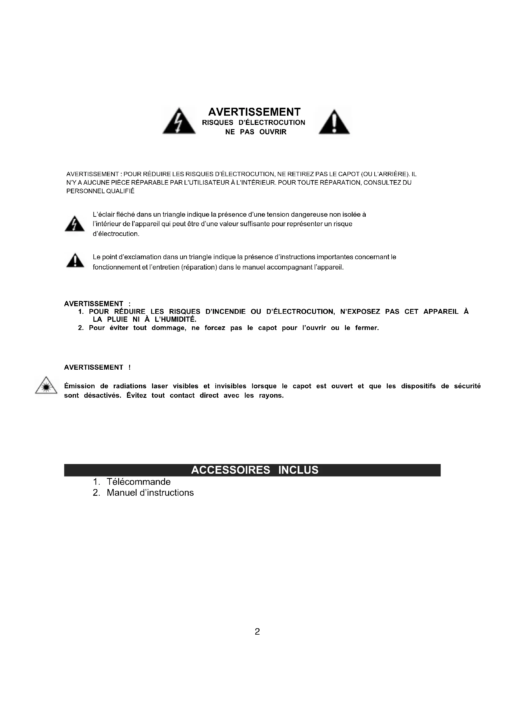 AVERTISSEMENT ! Émission de radiations laser visibles et invisibles lorsque le capot est ouvert et que les dispositifs de sécurité sont désactivés. Évitez tout contact direct avec les rayons. ACCESSOIRES INCLUS