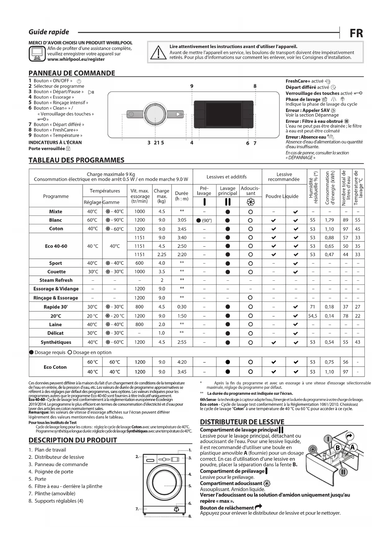 Guide rapide MERCI D’AVOIR CHOISI UN PRODUIT WHIRLPOOLAn de proter d’une assistance complète, veuillez enregistrer votre appareil sur www . whirlpool . eu/ registerLire attentivement les instructions avant d’utiliser l’appareil.Avant de mettre l’appareil en service, les boulons de transport doivent être impérativement retirés. Pour plus d’informations sur comment les enlever, voir les Consignes d’installation.