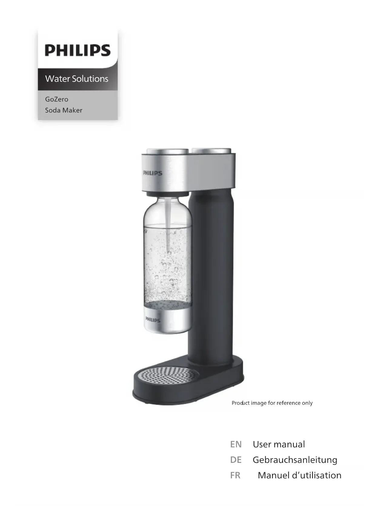 - Wischen Sie die Tropfschale ab, um diese trocken zu halten. 7 Gewährleistung & Service Wenn Sie Informationen benötigen bzw. Probleme haben, gehen Sie bitte auf die Webseite von Philips www.philips.com/water oder setzen Sie sich mit dem Philips Kundenservice in Ihrem Land in Verbindung. Gibt es keinen Kundenservice in Ihrem Land, wenden Sie sich bitte an Ihren Philips-Händler vor Ort.FR 9 1 Introduction Félicitations pour votre achat et bienvenue chez Philips ! Enregistrez votre produit sur www.philips.com/water pour pleinement profiter du support que nous vous proposons. 2 Consignes de sécurité Veuillez attentivement lire le présent mode d’emploi avant d’utiliser l’équipement et le conserver en cas de futur besoin. Avertissement général - NE PAS utiliser de bouteilles de gazéification d’une autre marque. Cela pourrait endommager la machine et mener à un risque de sécurité. - NE PAS gazéifier autre chose que de l’eau plate. Si l’eau contient du sucre ou un autre composant, les valves pourraient se mettre à fonctionner de manière inadéquate, l’utilisation du produit devenant alors dangereuse. - NE PAS ajouter de tranches de fruit, de glace ou de saveurs dans la bouteille pour la gazéification. Ajouter les saveurs uniquement APRÈS la gazéification. - NE PAS gazéifier une bouteille de gazéification vide. - NE PAS déplacer la machine à soda lors de la gazéification. - NE PAS gazéifier plus de 5 secondes. - Toujours utiliser sa machine à soda en position verticale. - Toujours maintenir la machine à soda à distance de toute source de chaleur ou d’ensoleillement direct. L’utiliser à température ambiante. - Conserver la machine à soda hors de la portée des enfants. L’utilisation n’est pas recommandée pour les enfants de moins de 12 ans sans la surveillance d’un adulte. Gazéication de la bouteille - Ne remplir la bouteille qu’avec de l’eau fraîche et claire ; remplir jusqu’à la jauge de niveau. - NE PAS utiliser de bouteilles autres que celles spécifiquement conçues pour la machine à soda Philips. Votre machine à soda Philips est conçue pour n’être utilisée qu’avec des bouteilles de gazéification Philips. L’utilisation d’autres bouteilles n’est pas recommandée. Les dommages résultant de l’utilisation de bouteilles autres que les bouteilles de gazéification Philips ne sont pas couverts par la garantie. - Ne jamais placer une bouteille dans un congélateur. - Toujours stocker la bouteille propre sans son bouchon en place pour éviter les bactéries et les mauvaises odeurs. Ce qui suit s'applique exclusivement aux bouteilles de gazéification en plastique : - Ne lavez jamais la bouteille en plastique au lave-vaisselle. NE PAS laver dans une eau présentant une température supérieure à 40 °C. - Les bouteilles Philips comportent une date d'expiration clairement inscrite dessus. Ne PAS utiliser les bouteilles de gazéification si la date d'expiration est dépassée.- N'utilisez jamais une bouteille ayant subi une déformation ou une décoloration, ou présentant des éraflures. Avant utilisation, vérifiez la date d'expiration sur la bouteille, et assurez-vous qu'il n'y ait ni détérioration, ni déformation. Remplacez toute bouteille de gazéification dont la date limite d'utilisation est dépassée, ou qui est endommagée ou déformée, par une neuve. Ce qui suit s'applique exclusivement aux bouteilles de gazéification 100 % inox : - N'utilisez jamais une bouteille ayant subi une déformation ou une décoloration, ou présentant des éraflures. Avant toute utilisation, assurez-vous qu'il n'y ait ni détérioration, ni déformation. Remplacez toute bouteille de gazéification endommagée ou déformée par une neuve. Cylindre de dioxyde de carbone (CO