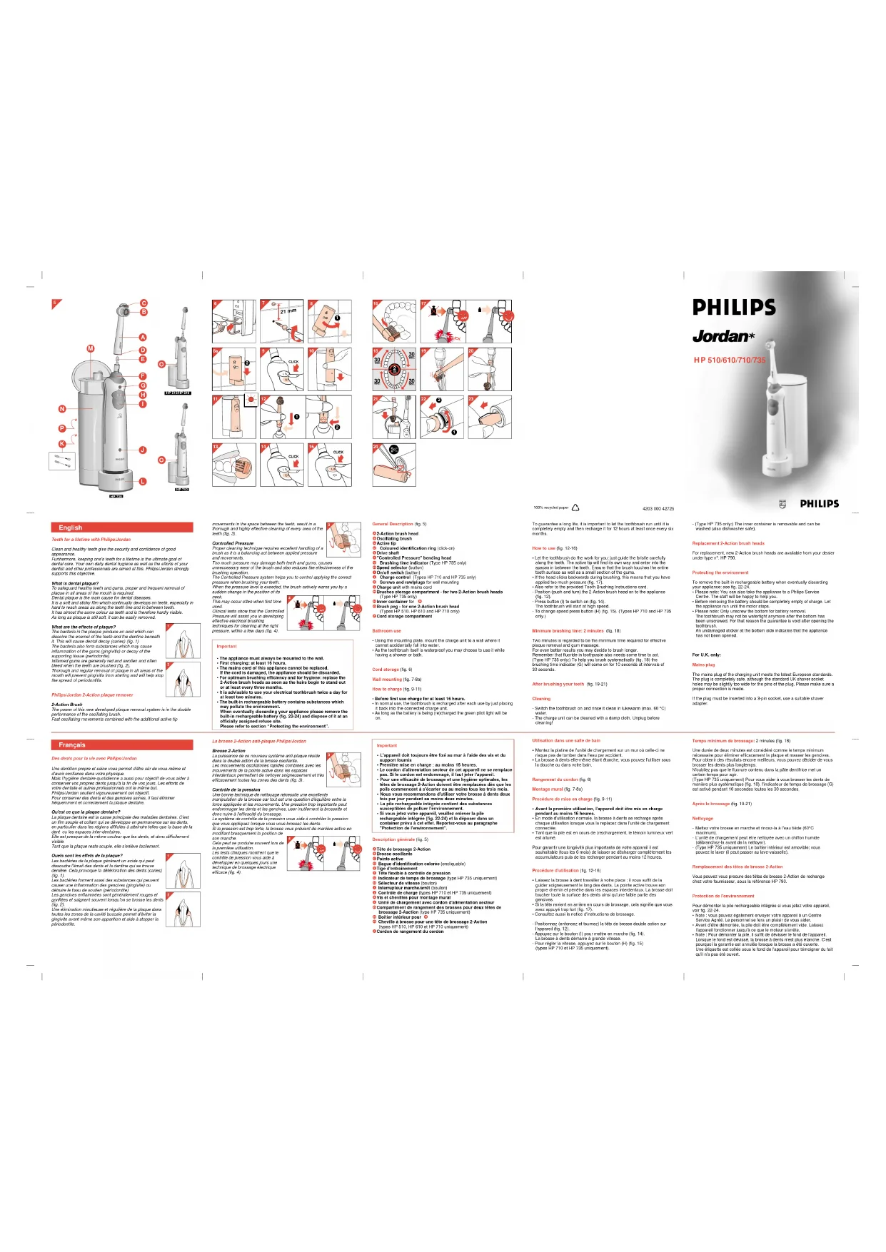 - The built-in rechargeable battery contains substances which may pollute the environment. When eventually discarding your appliance please remove the built-in rechargeable battery (fig. 22-24) and dispose of it at an officially assigned refuse site. Please refer to section “Protecting the environment”. La brosse 2-Action anti-plaque Philips/Jordan Brosse 2-Action La puissance de ce nouveau système anti-plaque réside dans la double action de la brosse oscillante. Les mouvements oscillatoires rapides combinés avec les mouvements de la pointe active dans les espaces interdentaux permettent de nettoyer soigneusement et très efficacement toutes les zones des dents (fig. 3). Contrôle de la pression Une bonne technique de nettoyage nécessite une excellente manipulation de la brosse car tout est une question d'équilibre entre la force appliquée et les mouvements. Une pression trop importante peut endommager les dents et les gencives, user inutilement la brossette et donc nuire à l'efficacité du brossage. Le système de contrôle de la pression vous aide à contrôler la pression que vous appliquez lorsque vous vous brossez les dents. Si la pression est trop forte, la brosse vous prévient de manière active en modifiant brusquement la position de son manche. Cela peut se produire souvent lors de la première utilisation. Les tests cliniques montrent que le contrôle de pression vous aide à développer en quelques jours une technique de brossage électrique efficace (fig. 4). Description générale (fig. 5) A Tête de brossage 2-Action B Brosse oscillante C Pointe active D Bague d'identification colorée (encliquable) E Tige d'entraînement F Tête flexible à contrôle de pression G Indicateur de temps de brossage (type HP 735 uniquement) H Sélecteur de vitesse (bouton) I Interrupteur marche/arrêt (bouton) J Contrôle de charge (types HP 710 et HP 735 uniquement) K Vis et chevilles pour montage mural L Unité de chargement avec cordon d'alimentation secteur M Compartiment de rangement des brosses pour deux têtes de brossage 2-Aaction (type HP 735 uniquement) N Boîtier intérieur pour M O Cheville à brosse pour une tête de brossage 2-Action (types HP 510, HP 610 et HP 710 uniquement) P Cordon de rangement du cordon Utilisation dans une salle de bain