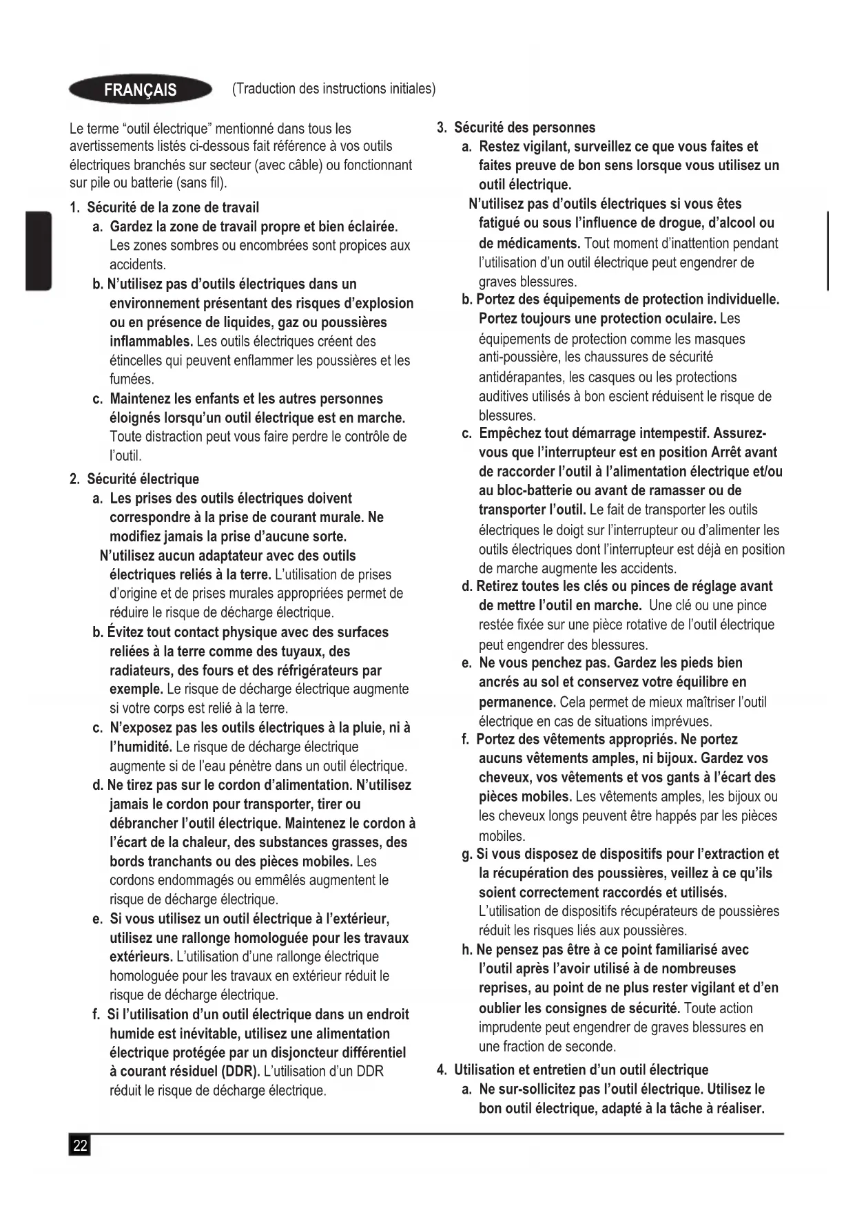 Avertissement ! Veuillez lire tous les avertissements de sécurité, toutes les instructions, toutes les illustrations et toutes les spécications fournies avec cet outil électrique. Le non-respect de toutes les instructions listées ci- dessous peut conduire à des décharges électriques, des incendies et/ou de graves blessures. Conservez tous les avertissements et toutes les instructions an de pouvoir vous y référer dans le futur.22 (Traduction des instructions initiales) FRANÇAIS Le terme “outil électrique” mentionné dans tous les avertissements listés ci-dessous fait référence à vos outils électriques branchés sur secteur (avec câble) ou fonctionnant sur pile ou batterie (sans l).