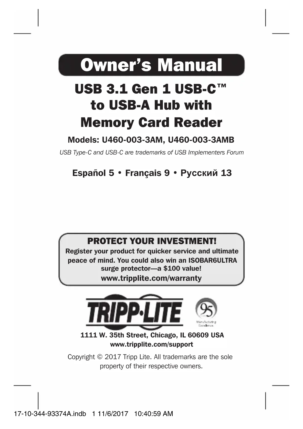 TRIPP LITE garantit que ses produits sont exempts de vices de matériaux et de fabrication pendant une période de trois (3) ans à partir de la date d'achat initiale. La responsabilité de TRIPP LITE, en vertu de la présente garantie, se limite à la réparation ou au remplacement (à sa seule discrétion) de ces produits défectueux. Pour obtenir réparation sous cette garantie, vous devez obtenir un numéro d'autorisation de retour de matériel (« RMA ») auprès de TRIPP LITE ou d'un centre de réparation autorisé par TRIPP LITE. Les produits doivent être retournés à TRIPP LITE ou à un centre de réparation autorisé par TRIPP LITE en port prépayé et être accompagnés d'une brève description du problème et d'un justificatif de la date et du lieu d'achat. Cette garantie ne s'applique pas au matériel ayant été endommagé suite à un accident, à une négligence ou à une application abusive, ou ayant été altéré ou modifié d'une façon quelconque. SAUF INDICATION CONTRAIRE DANS LES PRÉSENTES, TRIPP LITE N'ÉMET AUCUNE GARANTIE, EXPRESSE OU TACITE, Y COMPRIS DES GARANTIES DE QUALITÉ COMMERCIALE ET D'ADÉQUATION À UN USAGE PARTICULIER. Certains États n'autorisant pas la limitation ni l'exclusion de garanties tacites, les limitations ou exclusions susmentionnées peuvent ne pas s'appliquer à l'acheteur. À L'EXCEPTION DES DISPOSITIONS CI-DESSUS, TRIPP LITE NE POURRA EN AUCUN CAS ÊTRE TENUE RESPONSABLE DE DOMMAGES DIRECTS, INDIRECTS, SPÉCIAUX, FORTUITS OU CONSÉCUTIFS RÉSULTANT DE L'UTILISATION DE CE PRODUIT, MÊME SI AYANT ÉTÉ AVISÉE DE L'ÉVENTUALITÉ DE TELS DOMMAGES. Plus précisément, TRIPP LITE ne pourra être tenue responsable de coûts, tels que perte de bénéfices ou de recettes, perte de matériel, impossibilité d'utilisation du matériel, perte de logiciel, perte de données, frais de produits de remplacement, réclamations d'un tiers ou autres. Il est déconseillé d’utiliser cet équipement dans des applications médicales où une panne de cet équipement pourrait normalement provoquer la panne de l’équipement de survie ou altérer notablement sa sécurité ou son efficacité. La politique de Tripp Lite en est une d’amélioration continue. Les spécifications sont sujettes à changement sans préavis. 1111 W. 35th Street, Chicago, IL 60609 USA www.tripplite.com/support 17-10-344-93374A.indb 12 11/6/2017 10:41:00 AM13 USB-хаб с разъемами USB 3.1 Gen 1 USB-C™ / USB-A и устройством считывания карт