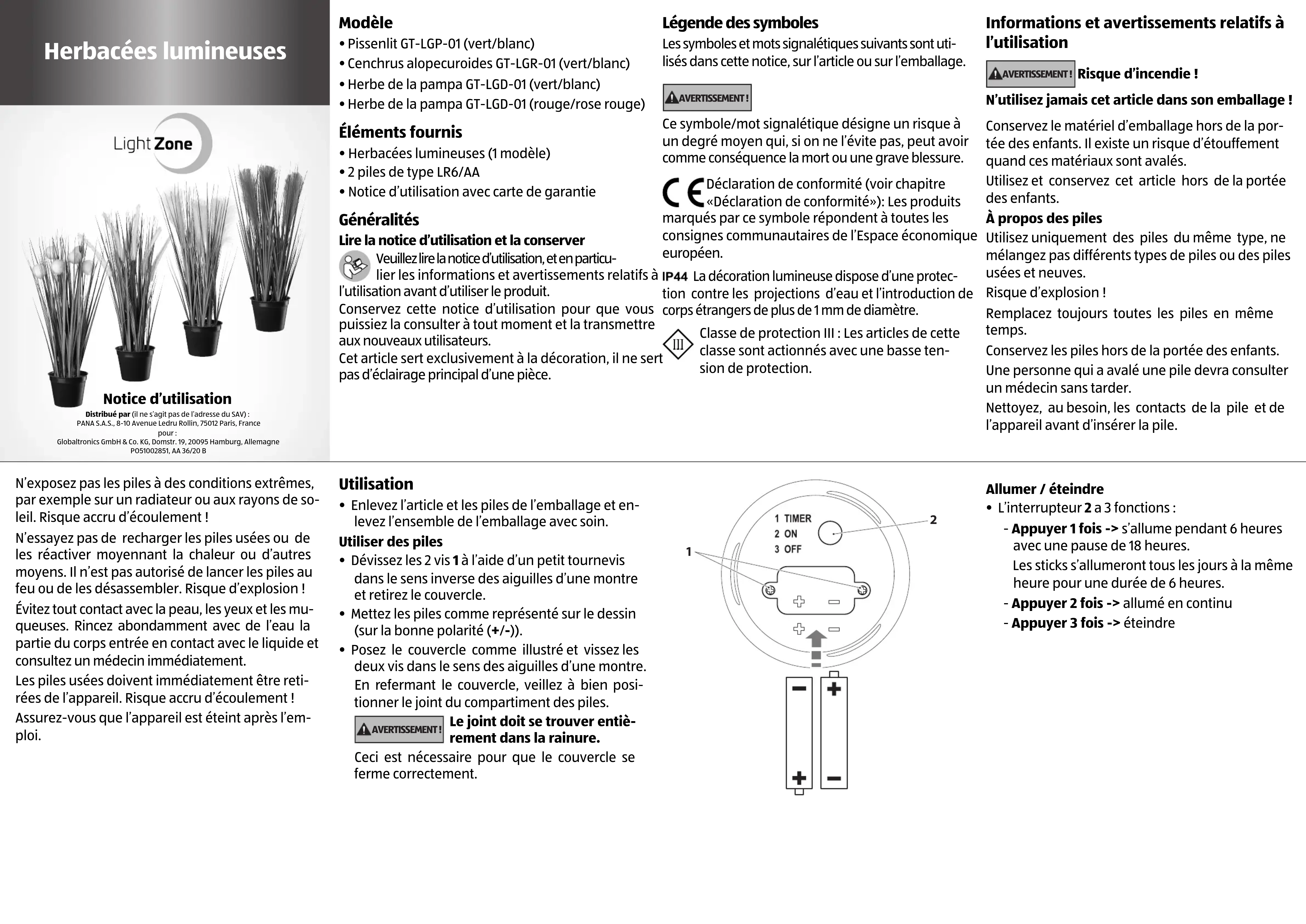 - L’interrupteur 2 a 3 fonctions : - Appuyer 1 fois -> s’allume pendant 6 heures avec une pause de 18 heures. Les sticks s’allumeront tous les jours à la même heure pour une durée de 6 heures. - Appuyer 2 fois -> allumé en continu - Appuyer 3 fois -> éteindre Herbacées lumineuses Notice d’utilisation Distribué par (il ne s’agit pas de l’adresse du SAV) :PANA S.A.S., 8-10 Avenue Ledru Rollin, 75012 Paris, Francepour :Globaltronics GmbH & Co. KG, Domstr. 19, 20095 Hamburg, AllemagnePO51002851, AA 36/20 BNettoyer et ranger