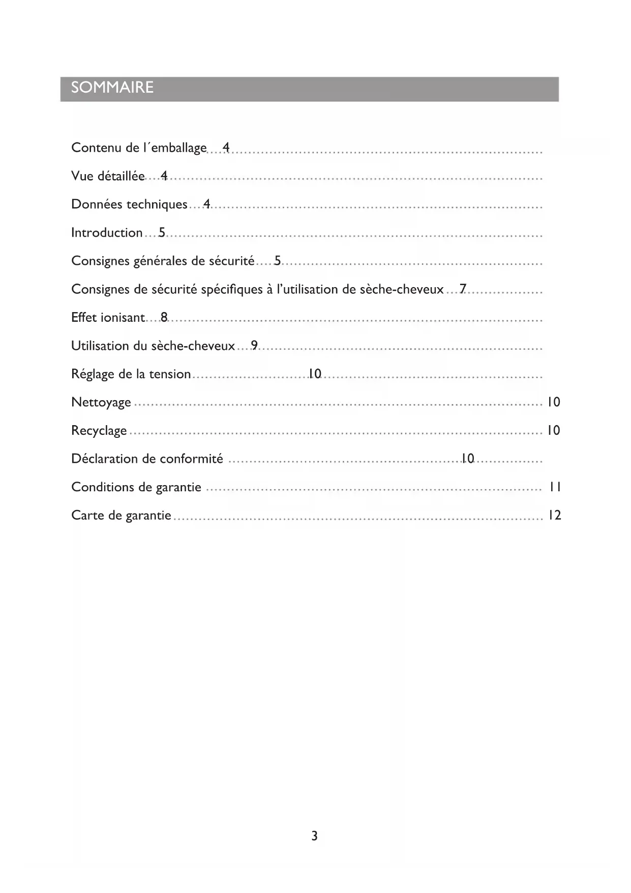 GT-HDt-02, 21/10 Notice d´utilisation Garantie3 SOMMAIRE Contenu de l´emballage 4 Vue détaillée 4 Données techniques 4 Introduction 5 Consignes générales de sécurité 5 Consignes de sécurité spéciques à l’utilisation de sèche-cheveux 7 Effet ionisant 8 Utilisation du sèche-cheveux 9 Réglage de la tension 10 Nettoyage 10 Recyclage 10 Déclaration de conformité 10 Conditions de garantie 11 Carte de garantie 124