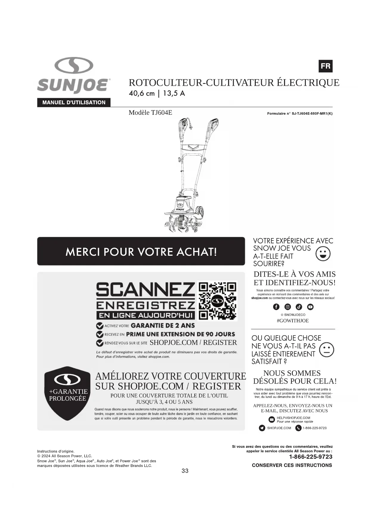 Modèle TJ604E ROTOCULTEUR-CULTIVATEUR ÉLECTRIQUE 40,6 cm | 13,5 A CONSERVER CES INSTRUCTIONSInstructions d’origine.© 2024 All Season Power, LLC.Snow Joe , Sun Joe , Aqua Joe , Auto Joe , et Power Joe sont des marques déposées utilisées sous licence de Weather Brands LLC.Si vous avez des questions ou des commentaires, veuillez appeler le service clientèle All Season Power au : 1-866-225-9723