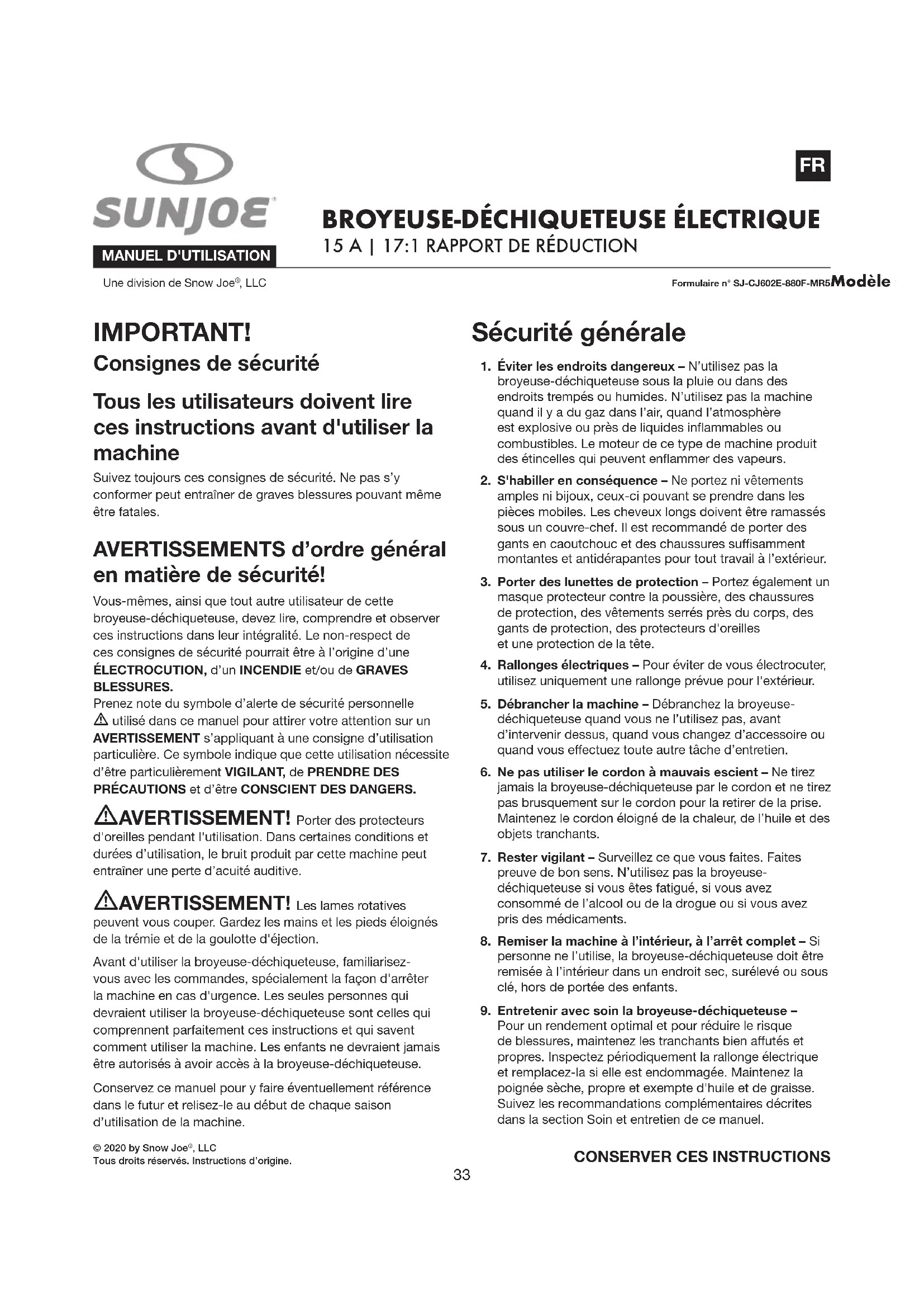 SP© 2020 by Snow Joe , LLCTous droits réservés. Instructions d’origine.
