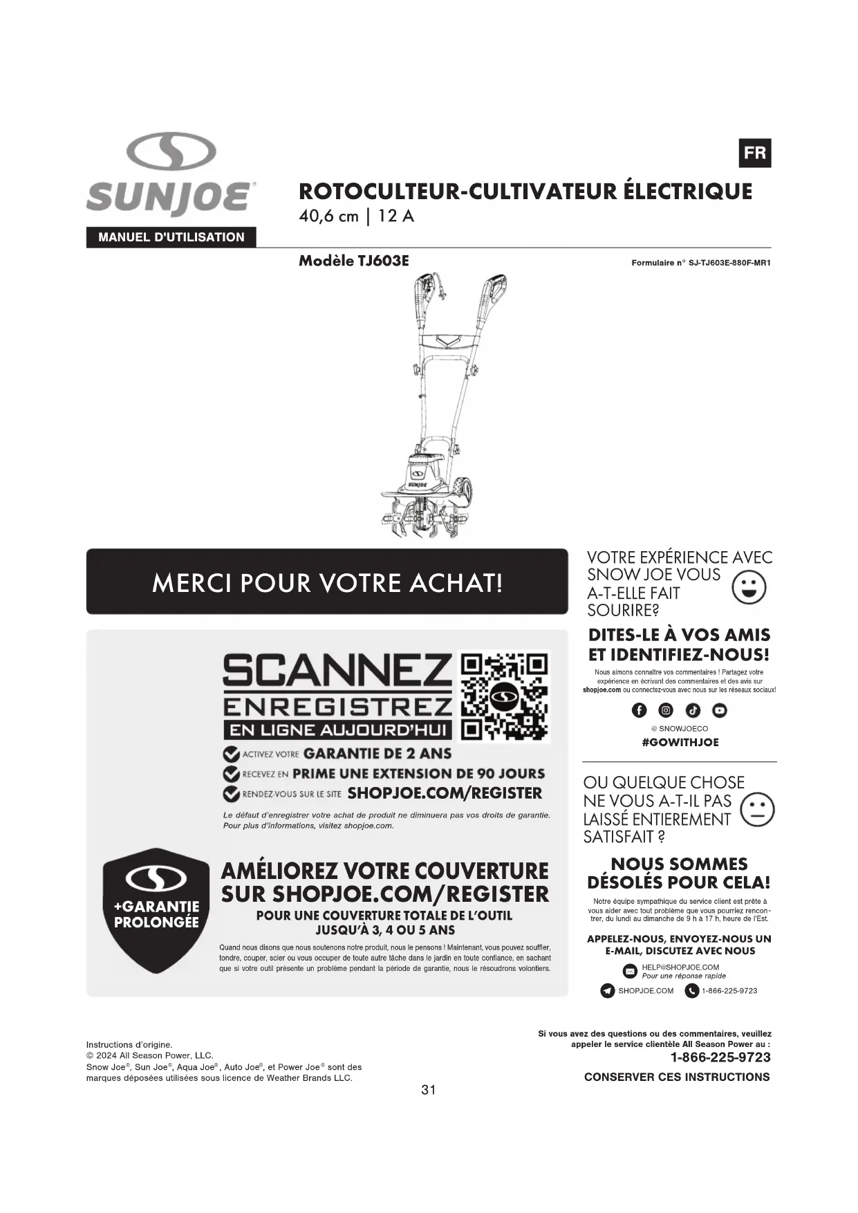 TMFR Formulaire n° SJ-TJ603E-880F-MR1MANUEL D'UTILISATION Modèle TJ603E ROTOCULTEUR-CULTIVATEUR ÉLECTRIQUE 40,6 cm | 12 A CONSERVER CES INSTRUCTIONSInstructions d’origine.© 2024 All Season Power, LLC.Snow Joe , Sun Joe , Aqua Joe , Auto Joe , et Power Joe sont des marques déposées utilisées sous licence de Weather Brands LLC.Si vous avez des questions ou des commentaires, veuillez appeler le service clientèle All Season Power au :1-866-225-9723 MERCI POUR VOTRE ACHAT! Le défaut d’enregistrer votre achat de produit ne diminuera pas vos droits de garantie. Pour plus d’informations, visitez shopjoe.com.