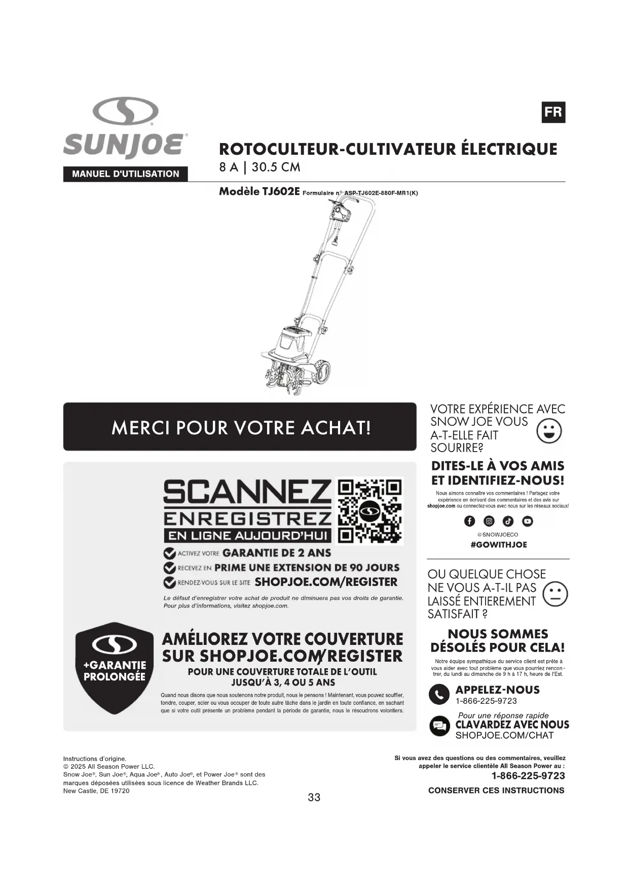 Lorsque vous enregistrez votre produit motorisé ou non motorisé après achat sur All Season Power via shopjoe. com/register, vous bénéficiez d'une couverture de garantie supplémentaire de 90 jours. De plus, vous aurez la possibilité d'acheter une extension de garantie au-delà de la garantie standard de 2 ans du fabricant. Vous avez le choix entre une, deux ou trois années d'extension de garantie par l'intermédiaire d'Extend, Inc. Des frais supplémentaires s'appliquent. Lorsque vous choisissez Joe®, vous n'achetez pas seulement une garantie prolongée ; vous achetez une tranquillité d'esprit totale en sachant que vous pouvez compter sur nos outils de premier ordre, notre soutien à la clientèle de premier ordre, notre couverture complète des produits et notre politique de retour sans tracas. Discutez avec nous à shopjoe. com/support ou appelez-nous au 1-866-225-9723 7 jours par semaine, de 10 h à 18 h (HNE). Nous sommes là pour vous aider!
