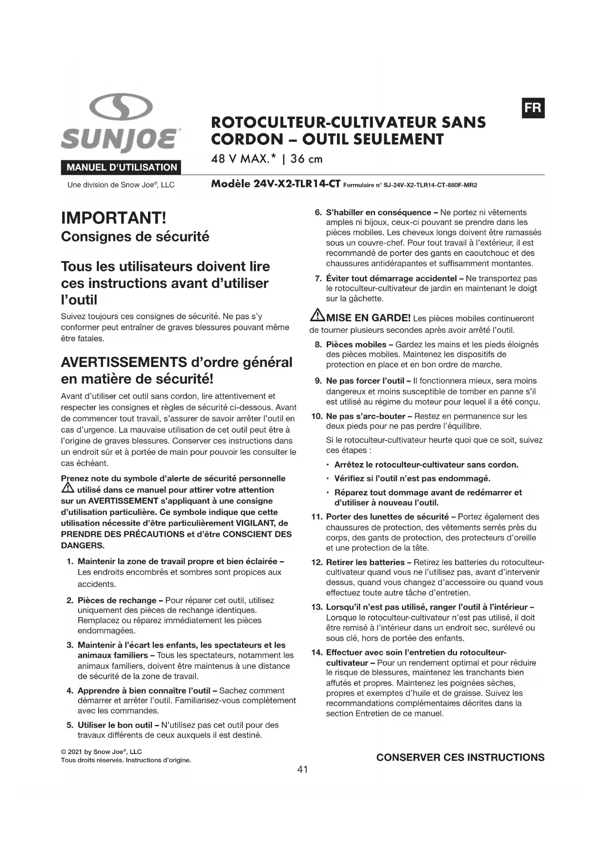 24VX2TLR14CT - Cultivateur Sun Joe - Notice d'utilisation et mode d'emploi gratuit
