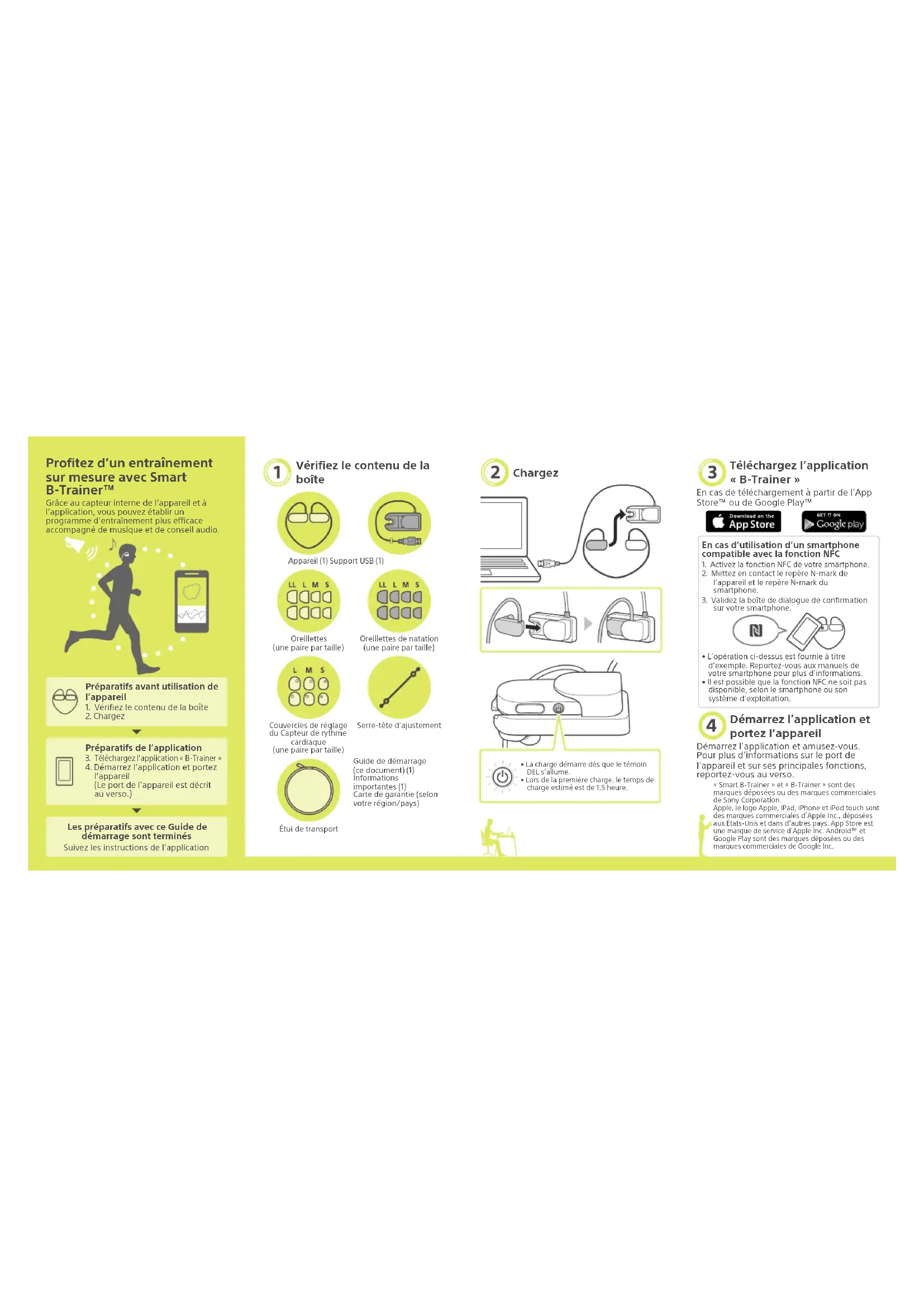 - Il est possible que la fonction NFC ne soit pas disponible, selon le smartphone ou son système d’exploitation. Démarrez l’application et portez l’appareil Démarrez l’application et amusez-vous. Pour plus d’informations sur le port de l’appareil et sur ses principales fonctions, reportez-vous au verso. «Smart B-Trainer» et «B-Trainer» sont des marques déposées ou des marques commerciales de Sony Corporation.Apple, le logo Apple, iPad, iPhone et iPod touch sont des marques commerciales d’Apple Inc., déposées aux États-Unis et dans d’autres pays. App Store est une marque de service d’Apple Inc. Android™ et Google Play sont des marques déposées ou des marques commerciales de Google Inc.DÉMARRAGE! Guide de démarrage de Smart B-Trainer™ Pour plus de détails et de précautions, reportez-vous au Guide d’aide (manuel Web).http://rd1.sony.net/help/sports/btr1/h_zz/4-567-644-21(1)SSE-BTR1©2015 Sony CorporationPrinted in Malaysia Comment porter l’appareil / Fonctions principales Divers capteurs vous permettent de mesurer votre condition physique et certaines activités, notamment votre rythme cardiaque ou votre position. Pour une mesure précise, portez correctement l’appareil. Oreille gauche Oreille droite Zone de détection du rythme cardiaqueTémoin DEL BLUETOOTHRepère NFCTouche VOL (volume)Touche (BLUETOOTH)/SELECTappui court: changement de mode (appareil/diffusion BLUETOOTH)appui long: activation/désactivation de la fonction BLUETOOTHappui long (plus de 7 sec.): jumelageTouche (alimentation)/INFO/ TÉMOIN DEL D’ALIMENTATION ET DE FONCTIONNEMENTappui long: mise sous/hors tensionappui court: affichage d’informations (mise sous tension requise), début/fin d’appel téléphonique (en cas de connexion au BLUETOOTH)appui long (plus de 8 sec.): réinitialisationTouche STARTappui court: démarrage/suspension de l’entraînementappui long: arrêt de l’entraînementTouche /appui court: morceau suivant/précédentappui long: changement d’intensité (pendant l’entraînement)Touche /MEMOappui court: démarrage/suspension de la musiqueappui long: mémo vocalLa touche possède un point tactile. Adaptez correctement l’appareil à l’oreille Placez convenablement la zone de détection du rythme cardiaque à l’intérieur de l’oreille droite.En cas d’écartement ou de mauvais ajustement, essayez de procéder de la manière illustrée ci-dessous. Changez de taille d’oreillettes Changez de taille de couvercles de réglage du Capteur de rythme cardiaqueSi vous nagez en portant l’appareil, n’oubliez pas de fixer les oreillettes de natation pour une parfaite étanchéité. Fixez éventuellement le serre-tête d’ajustementZone de détection rythme cardiaque