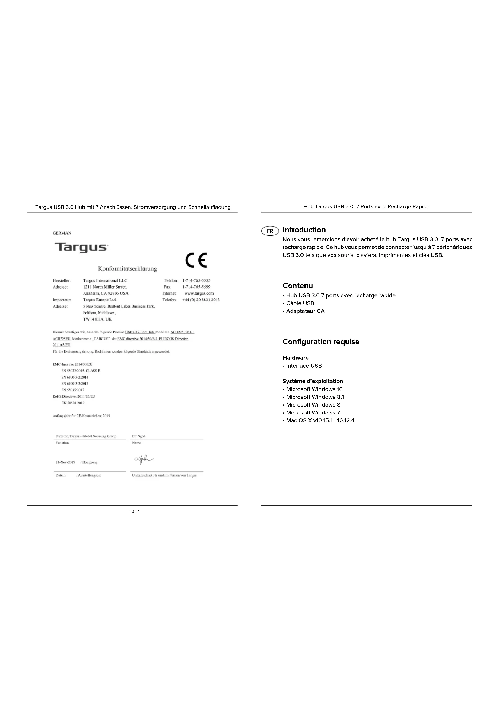 Hub Targus USB 3.0 7 Ports avec Recharge Rapide15 16 Hub Targus USB 3.0 7 Ports avec Recharge Rapide Connexion du hub à votre ordinateur Ce hub est un dispositif plug and play. Il fonctionne automatiquement lorsque le câble USB est branché à l’ordinateur. REMARQUE : SI L’ALIMENTATION EST INSUFFISANTE APRÈS LA CONNEXION DES PÉRIPHÉRIQUES USB AU HUB 7 PORTS, BRANCHEZ L’ADAPTATEUR CA AFIN DE FOURNIR PLUS DE PUISSANCE AUX PÉRIPHÉRIQUES. UTILISEZ UNIQUEMENT L’ADAPTATEUR CA FOURNI. L’UTILISATION D’UN ADAPTATEUR CA TIERS PEUT ENDOMMAGER LE HUB USB ET D’AUTRES PÉRIPHÉRIQUES USB CONNECTÉS ET ANNULER VOTRE GARANTIE. Adaptateur CA Notation électriqueEntrée: 100 - 240 V 50/60 HzSortie: 5V 4A ATTENTION : Utilisez uniquement l’adaptateur CA fourni. L’utilisation d’un adaptateur CA tiers peut endommager le hub USB et d’autres périphériques USB connectés et annuler votre garantie. Description des caractéristiques Hub Targus USB 3.0 7 Ports avec Recharge Rapide Port USB 3.0 en amont (se connecte au PC)Connecteur d’alimentation pour adaptateurCAPort USB 3.0Ports USB 3.0 avec recharge rapidePort USB 3.0Port USB 3.0DevantCôté CôtéArrière Ports USB 3.0