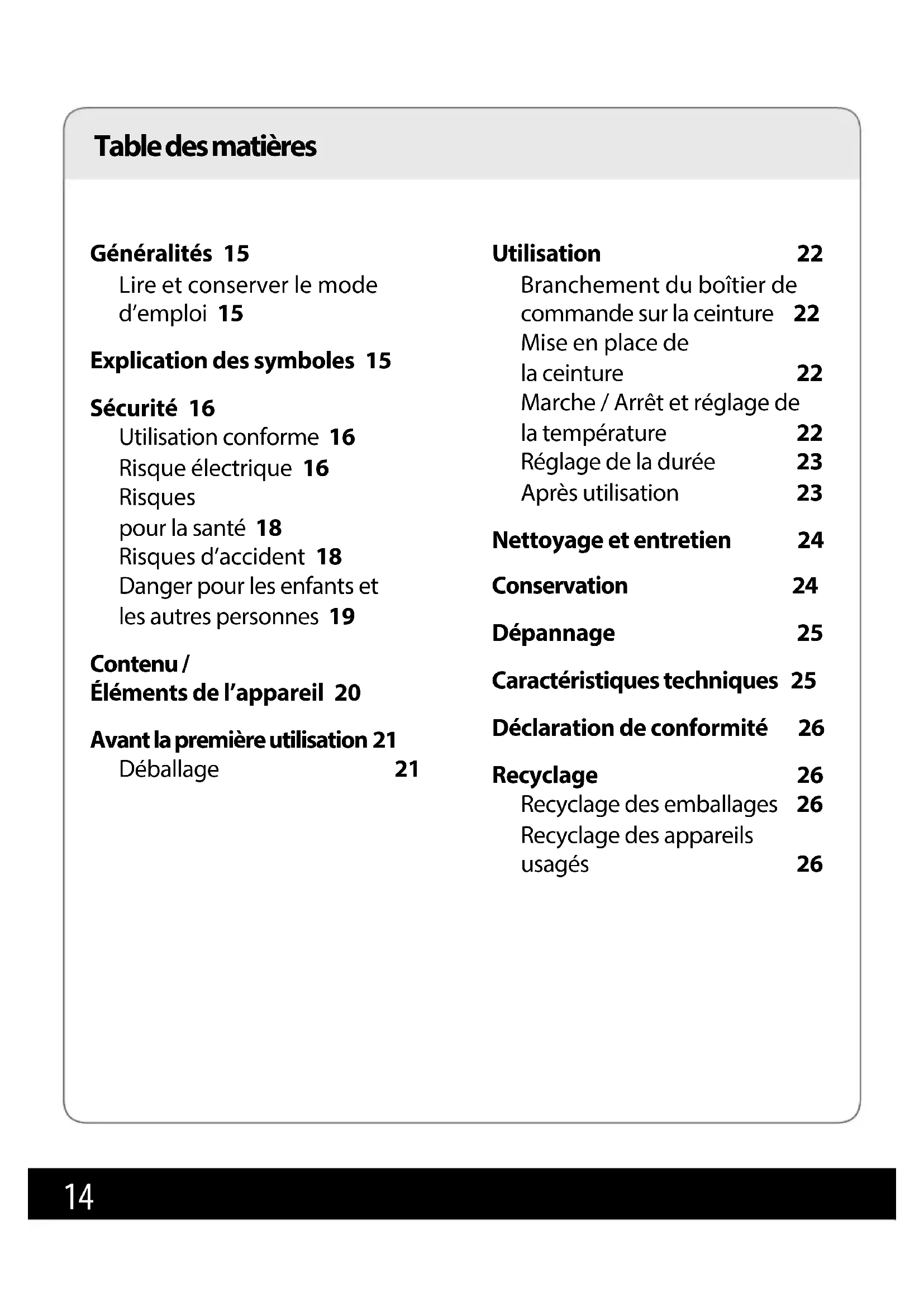 - Cet appareil doit être utilisé exclusive- ment à l’intérieur et à l’abri de l’humidité. Risque électrique Le boîtier de com- mande et la prise ne doivent pas être exposés à des gouttes ou des projections d’eau. Ne ja- mais plonger ces éléments dans l’eau ou d’autres liquides. Si un liquide pénètre à l’intérieur, il existe un risque de choc électrique. Après lavage, attendre le séchage com- plet de la ceinture avant de l’utiliser à nouveau.