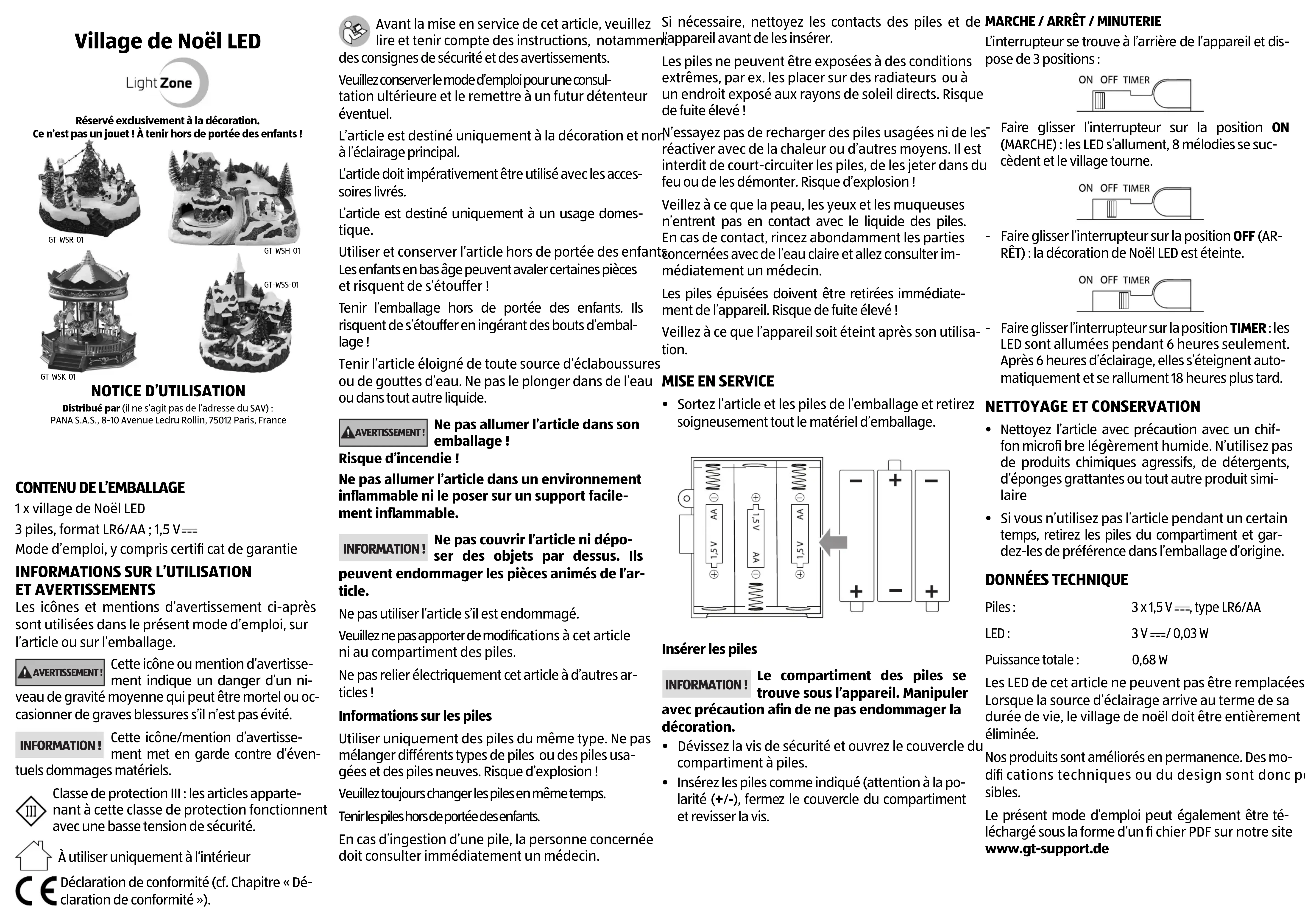 Piles : 3 x 1,5 V , type LR6/AA LED : 3 V / 0,03 W Puissance totale : 0,68 W Les LED de cet article ne peuvent pas être remplacées. Lorsque la source d’éclairage arrive au terme de sa durée de vie, le village de noël doit être entièrement éliminée. Nos produits sont améliorés en permanence. Des mo- difi cations techniques ou du design sont donc pos- sibles. Le présent mode d’emploi peut également être té- léchargé sous la forme d’un fi chier PDF sur notre site www.gt-support.de Village de Noël LED Réservé exclusivement à la décoration.Ce n’est pas un jouet ! À tenir hors de portée des enfants !