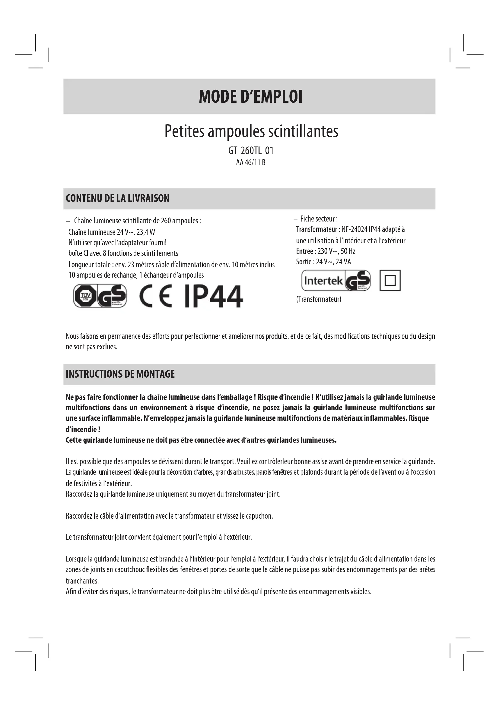 Ne pas faire fonctionner la chaîne lumineuse dans l‘emballage ! Risque d’incendie ! N’utilisez jamais la guirlande lumineuse multifonctions dans un environnement à risque d’incendie, ne posez jamais la guirlande lumineuse multifonctions sur une surface inflammable. N’enveloppez jamais la guirlande lumineuse multifonctions de matériaux inflammables. Risque d’incendie ! Cette guirlande lumineuse ne doit pas être connectée avec d‘autres guirlandes lumineuses. Il est possible que des ampoules se dévissent durant le transport. Veuillez contrôlerleur bonne assise avant de prendre en service la guirlande. La guirlande lumineuse est idéale pour la décoration d‘arbres, grands arbustes, parois fenêtres et plafonds durant la période de l‘avent ou à l‘occasion de festivités à l‘extérieur. Raccordez la guirlande lumineuse uniquement au moyen du transformateur joint. Raccordez le câble d‘alimentation avec le transformateur et vissez le capuchon. Le transformateur joint convient également pour l‘emploi à l‘extérieur. Lorsque la guirlande lumineuse est branchée à l‘intérieur pour l‘emploi à l‘extérieur, il faudra choisir le trajet du câble d‘alimentation dans les zones de joints en caoutchouc flexibles des fenêtres et portes de sorte que le câble ne puisse pas subir des endommagements par des arêtes tranchantes. Afin d‘éviter des risques, le transformateur ne doit plus être utilisé dès qu‘il présente des endommagements visibles. – Fiche secteur : Transformateur : NF-24024 IP44 adapté à une utilisation à l‘intérieur et à l‘extérieur Entrée : 230 V~, 50 Hz Sortie : 24 V~, 24 VA (Transformateur)AMPOULES DEFECTUEUSES Les ampoules défectueuses ou manquantes doivent immédiatement être remplacées par les ampoules de rechange jointes afin d‘éviter que la guirlande se surchauffe par la surcharge qui s‘ensuit, et pour prévenir que d‘autres ampoules s‘endommagent. Les ampoules de rechanges sont disponibles dans le commerce spécialisé. Utilisez exclusivement des ampoules du même type 1,8 V/ 0,09 W. Remplacez les ampoules uniquement après avoir retiré le câble de la prise murale du secteur. Les ampoules individuelles sont munies d‘une douille voleuse. Ne les dévissez pas de la douille, il suffit de les retirer en direction verticale. Vous pouvez utiliser l‘échangeur d‘ampoules joint à l‘emballage pour ménager vos ongles.