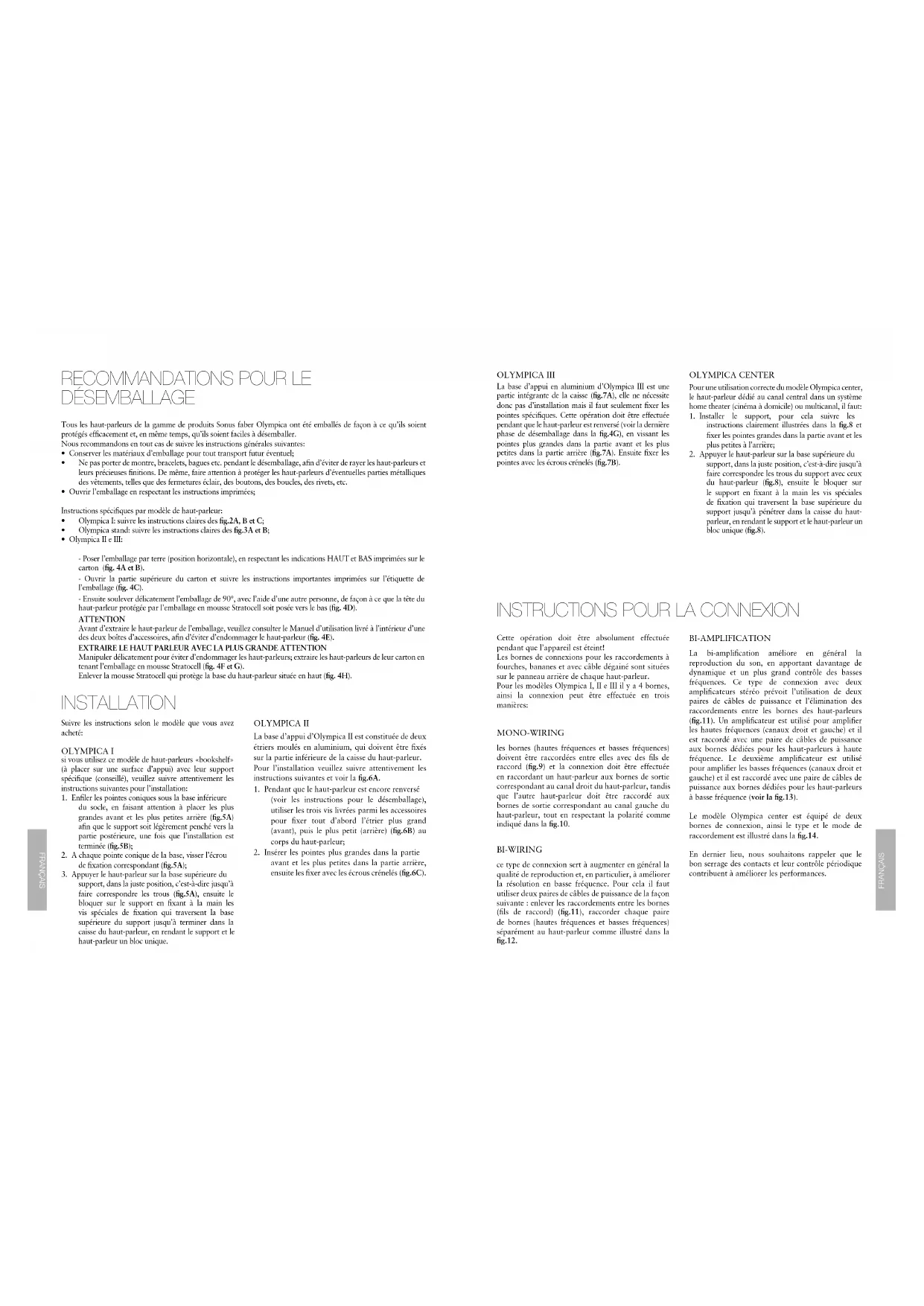avant et les plus petites dans la partie arrière, ensuite les fixer avec les écrous crénelés (fig.6C). La base d’appui en aluminium d’Olympica III est une partie intégrante de la caisse (fig.7A), elle ne nécessite donc pas d’installation mais il faut seulement fixer les pointes spécifiques. Cette opération doit être effectuée pendant que le haut-parleur est renversé (voir la dernière phase de désemballage dans la fig.4G), en vissant les pointes plus grandes dans la partie avant et les plus petites dans la partie arrière (fig.7A). Ensuite fixer les pointes avec les écrous crénelés (fig.7B). OLYMPICA I OLYMPICA CENTER OLYMPICA II OLYMPICA III Tous les haut-parleurs de la gamme de produits Sonus faber Olympica ont été emballés de façon à ce qu’ils soient protégés efficacement et, en même temps, qu’ils soient faciles à désemballer. Nous recommandons en tout cas de suivre les instructions générales suivantes: