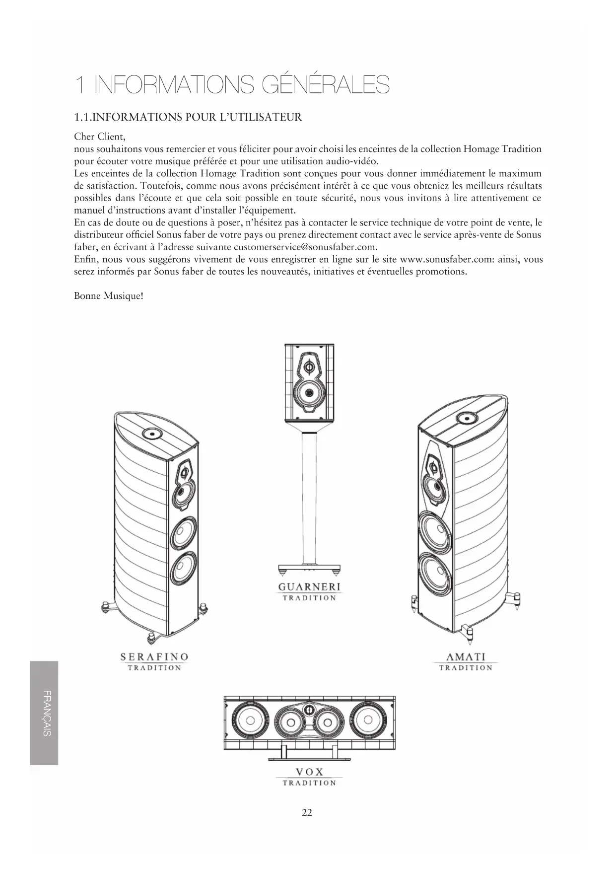 Cher Client, nous souhaitons vous remercier et vous féliciter pour avoir choisi les enceintes de la collection Homage Tradition pour écouter votre musique préférée et pour une utilisation audio-vidéo. Les enceintes de la collection Homage Tradition sont conçues pour vous donner immédiatement le maximum de satisfaction. Toutefois, comme nous avons précisément intérêt à ce que vous obteniez les meilleurs résultats possibles dans l’écoute et que cela soit possible en toute sécurité, nous vous invitons à lire attentivement ce manuel d’instructions avant d’installer l’équipement. En cas de doute ou de questions à poser, n’hésitez pas à contacter le service technique de votre point de vente, le distributeur officiel Sonus faber de votre pays ou prenez directement contact avec le service après-vente de Sonus faber, en écrivant à l’adresse suivante customerservice@sonusfaber.com. Enfin, nous vous suggérons vivement de vous enregistrer en ligne sur le site www.sonusfaber.com: ainsi, vous serez informés par Sonus faber de toutes les nouveautés, initiatives et éventuelles promotions. Bonne Musique!