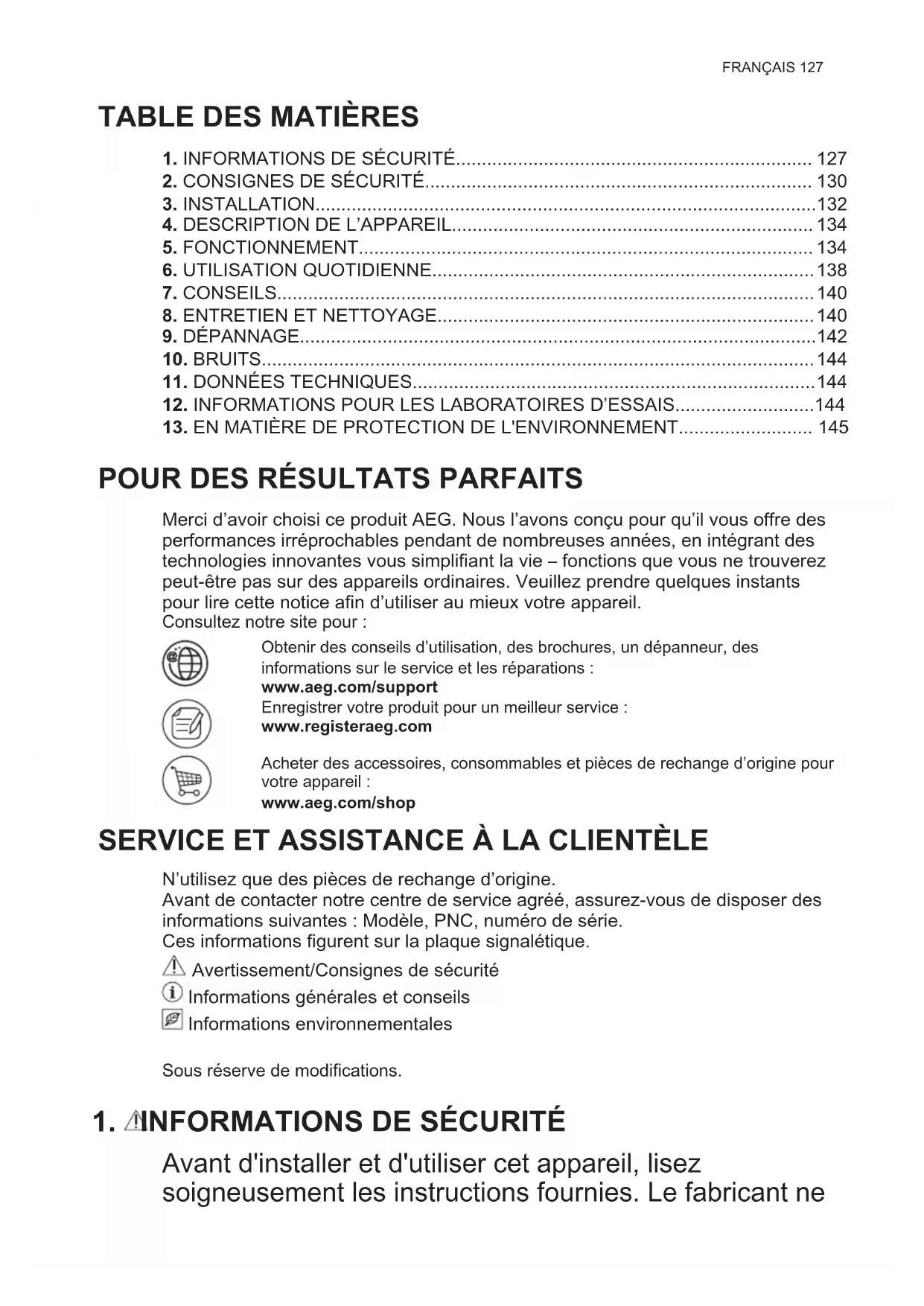 Merci d’avoir choisi ce produit AEG. Nous l’avons conçu pour qu’il vous offre des performances irréprochables pendant de nombreuses années, en intégrant des technologies innovantes vous simplifiant la vie – fonctions que vous ne trouverez peut-être pas sur des appareils ordinaires. Veuillez prendre quelques instants pour lire cette notice afin d’utiliser au mieux votre appareil. Consultez notre site pour : Obtenir des conseils d’utilisation, des brochures, un dépanneur, des informations sur le service et les réparations : www.aeg.com/support Enregistrer votre produit pour un meilleur service : www.registeraeg.com Acheter des accessoires, consommables et pièces de rechange d’origine pour votre appareil : www.aeg.com/shop