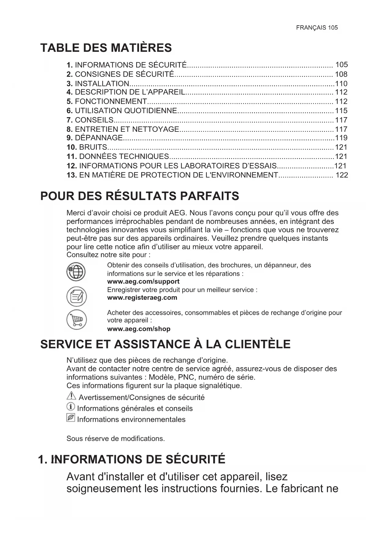 Merci d’avoir choisi ce produit AEG. Nous l’avons conçu pour qu’il vous offre des performances irréprochables pendant de nombreuses années, en intégrant des technologies innovantes vous simplifiant la vie – fonctions que vous ne trouverez peut-être pas sur des appareils ordinaires. Veuillez prendre quelques instants pour lire cette notice afin d’utiliser au mieux votre appareil. Consultez notre site pour : Obtenir des conseils d’utilisation, des brochures, un dépanneur, des informations sur le service et les réparations : www.aeg.com/support Enregistrer votre produit pour un meilleur service : www.registeraeg.com Acheter des accessoires, consommables et pièces de rechange d’origine pour votre appareil : www.aeg.com/shop