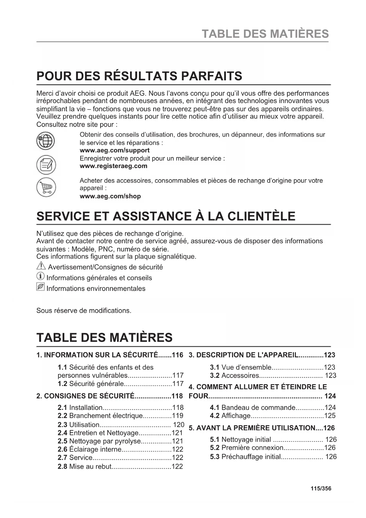 Recycle materials with the symbol . Put the packaging in relevant containers to recycle it. Help protect the environment and human health by recycling waste of electrical and electronic appliances. Do not dispose of appliances marked with the symbol with the household waste. Return the product to your local recycling facility or contact your municipal office. 114/356 TAKE A SHORTCUT!POUR DES RÉSULTATS PARFAITS Merci d’avoir choisi ce produit AEG. Nous l’avons conçu pour qu’il vous offre des performances irréprochables pendant de nombreuses années, en intégrant des technologies innovantes vous simplifiant la vie – fonctions que vous ne trouverez peut-être pas sur des appareils ordinaires. Veuillez prendre quelques instants pour lire cette notice afin d’utiliser au mieux votre appareil. Consultez notre site pour : Obtenir des conseils d’utilisation, des brochures, un dépanneur, des informations sur le service et les réparations : www.aeg.com/support Enregistrer votre produit pour un meilleur service : www.registeraeg.com Acheter des accessoires, consommables et pièces de rechange d’origine pour votre appareil : www.aeg.com/shop