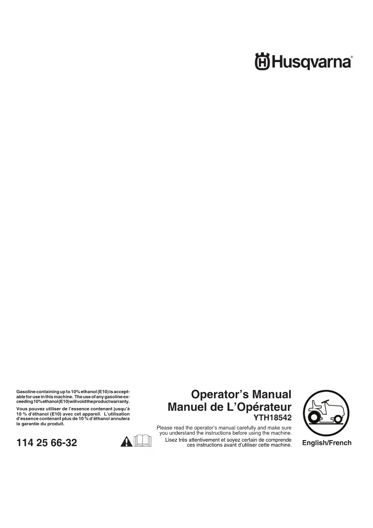 English/French 114 25 66-32 Operator’s Manual Manuel de L’Opérateur YTH18542 Gasoline containing up to 10% ethanol (E10) is accept-able for use in this machine. The use of any gasoline ex-ceeding 10% ethanol (E10) will void the product warranty.Vous pouvez utiliser de l’essence contenant jusqu’à 10 % d’éthanol (E10) avec cet appareil. L’utilisation d’essence contenant plus de 10 % d’éthanol annulera la garantie du produit. Please read the operator’s manual carefully and make sure you understand the instructions before using the machine. Lisez très attentivement et soyez certain de comprende ces instructions avant d’utiliser cette machine.2