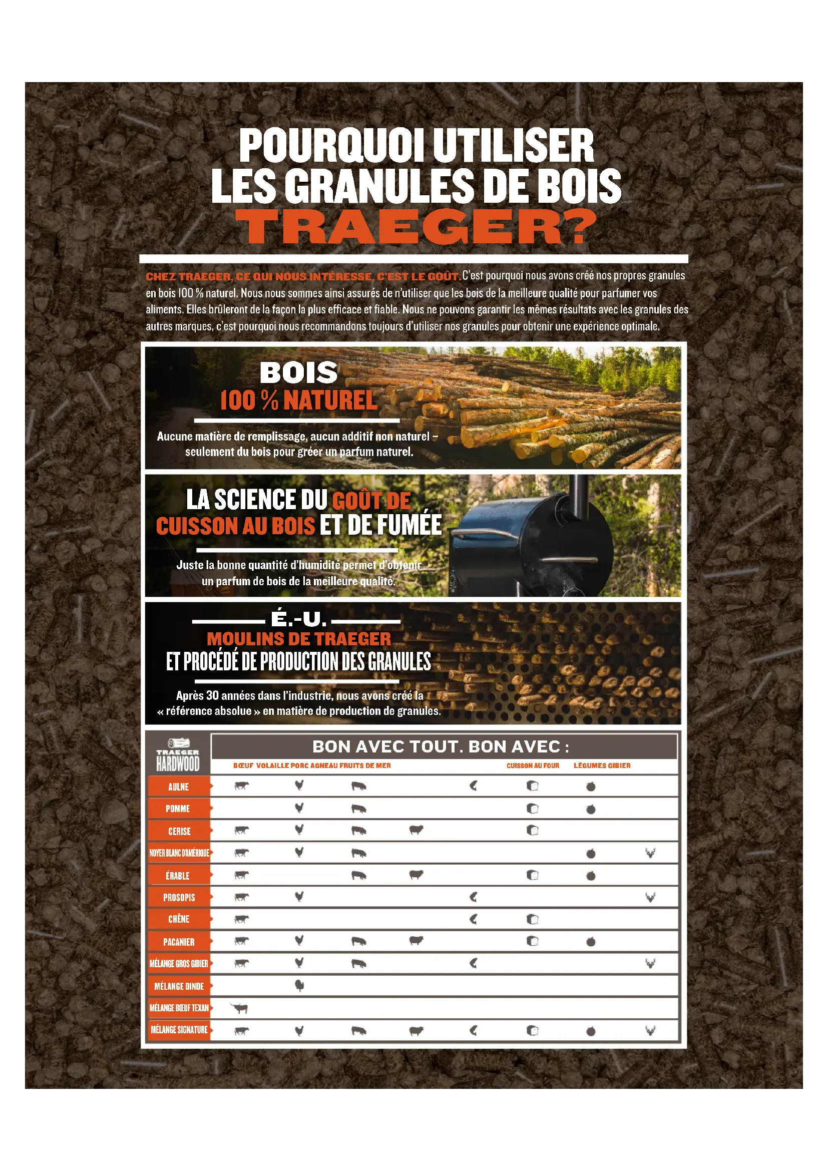 ENTRETIEN ET GARANTIE6CHEZ TRAEGER, CE QUI NOUS INTÉRESSE, C’EST LE GOÛT. C’est pourquoi nous avons créé nos propres granules en bois 100% naturel. Nous nous sommes ainsi assurés de n’utiliser que les bois de la meilleure qualité pour parfumer vos aliments. Elles brûleront de la façon la plus ecace et fiable. Nous ne pouvons garantir les mêmes résultats avec les granules des autres marques, c’est pourquoi nous recommandons toujours d’utiliser nos granules pour obtenir une expérience optimale.