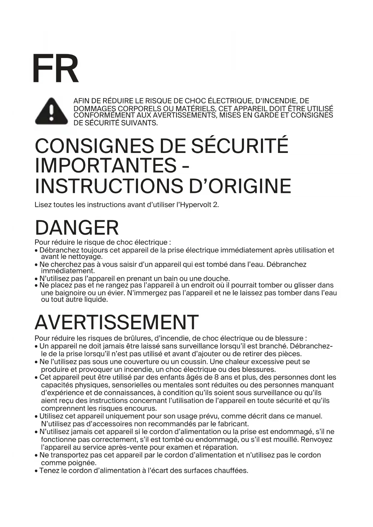 Lisez toutes les instructions avant d’utiliser l’Hypervolt2. DANGER Pour réduire le risque de choc électrique: