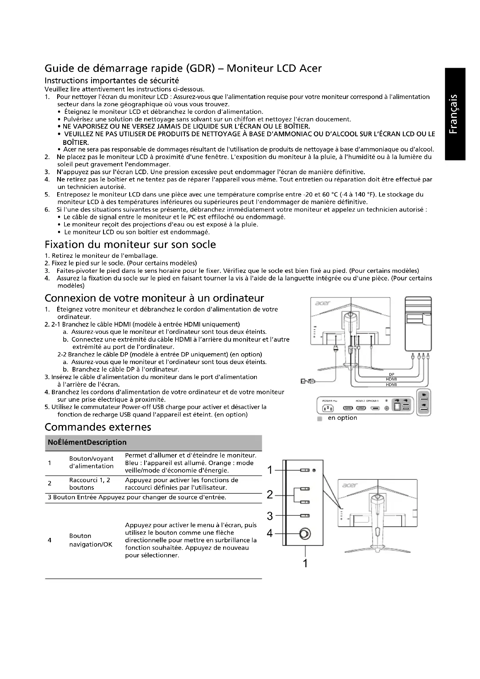 ordinateur.2. 2-1 Branchez le câble HDMI (modèle à entrée HDMI uniquement)a. Assurez-vous que le moniteur et l'ordinateur sont tous deux éteints. b. Connectez une extrémité du câble HDMI à l’arrière du moniteur et l’autre extrémité au port de l’ordinateur.2-2 Branchez le câble DP (modèle à entrée DP uniquement) (en option)a. Assurez-vous que le moniteur et l'ordinateur sont tous deux éteints.b. Branchez le câble DP à l'ordinateur.3. Insérez le câble d'alimentation du moniteur dans le port d'alimentation à l'arrière de l'écran.4. Branchez les cordons d'alimentation de votre ordinateur et de votre moniteur sur une prise électrique à proximité. 5. Utilisez le commutateur Power-off USB charge pour activer et désactiver la fonction de recharge USB quand l'appareil est éteint. (en option) Commandes externes No Élément Description