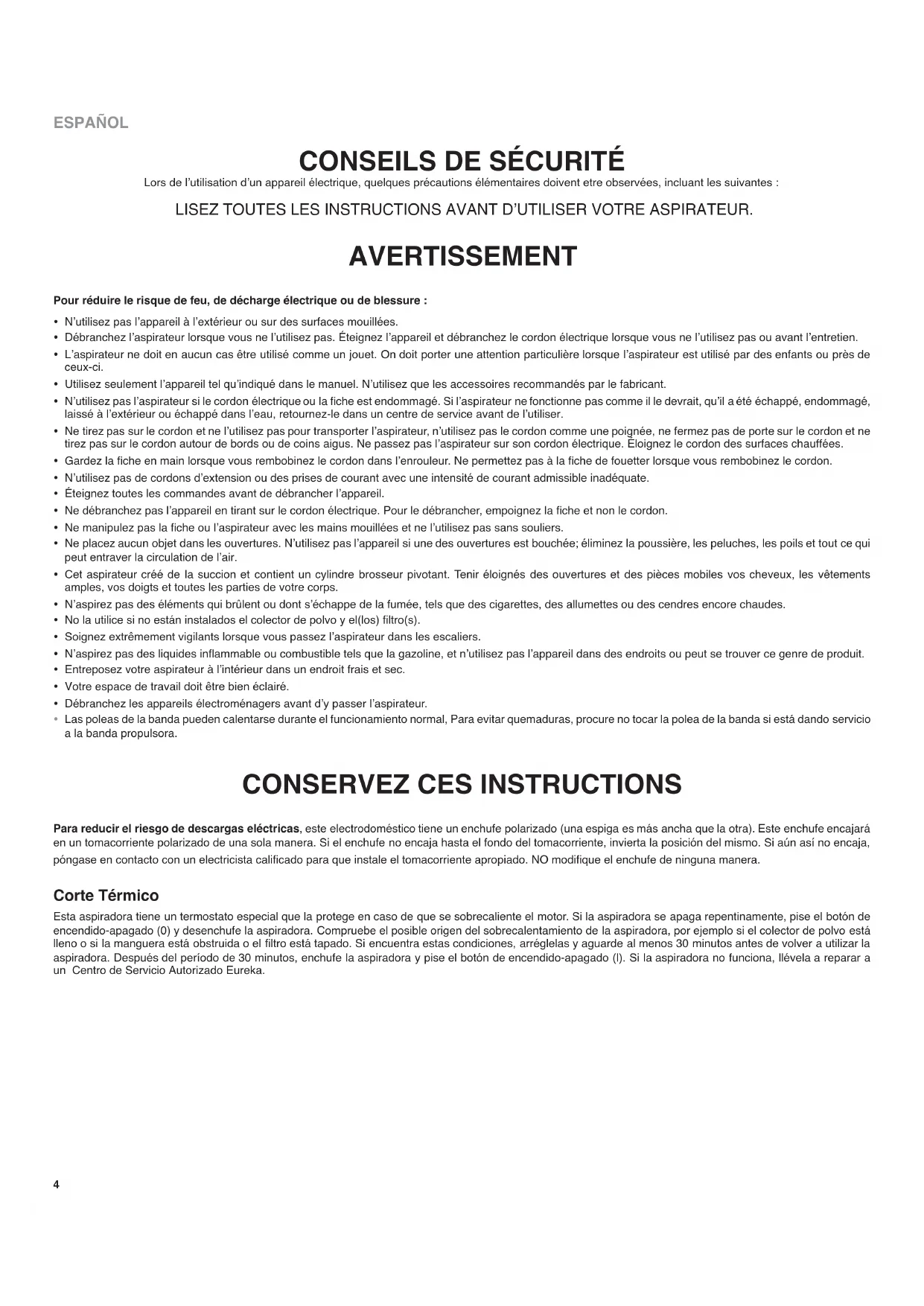 Lors de l’utilisation d’appareils électriques, prenez toujours les précautions de base, comprenant ce qui suit : AVANT D’UTILISER CET ASPIRATEUR ÉLECTRIQUE, LISEZ TOUTES LES INSTRUCTIONS COMPRISES DANS LE PRÉSENT LIVRET.