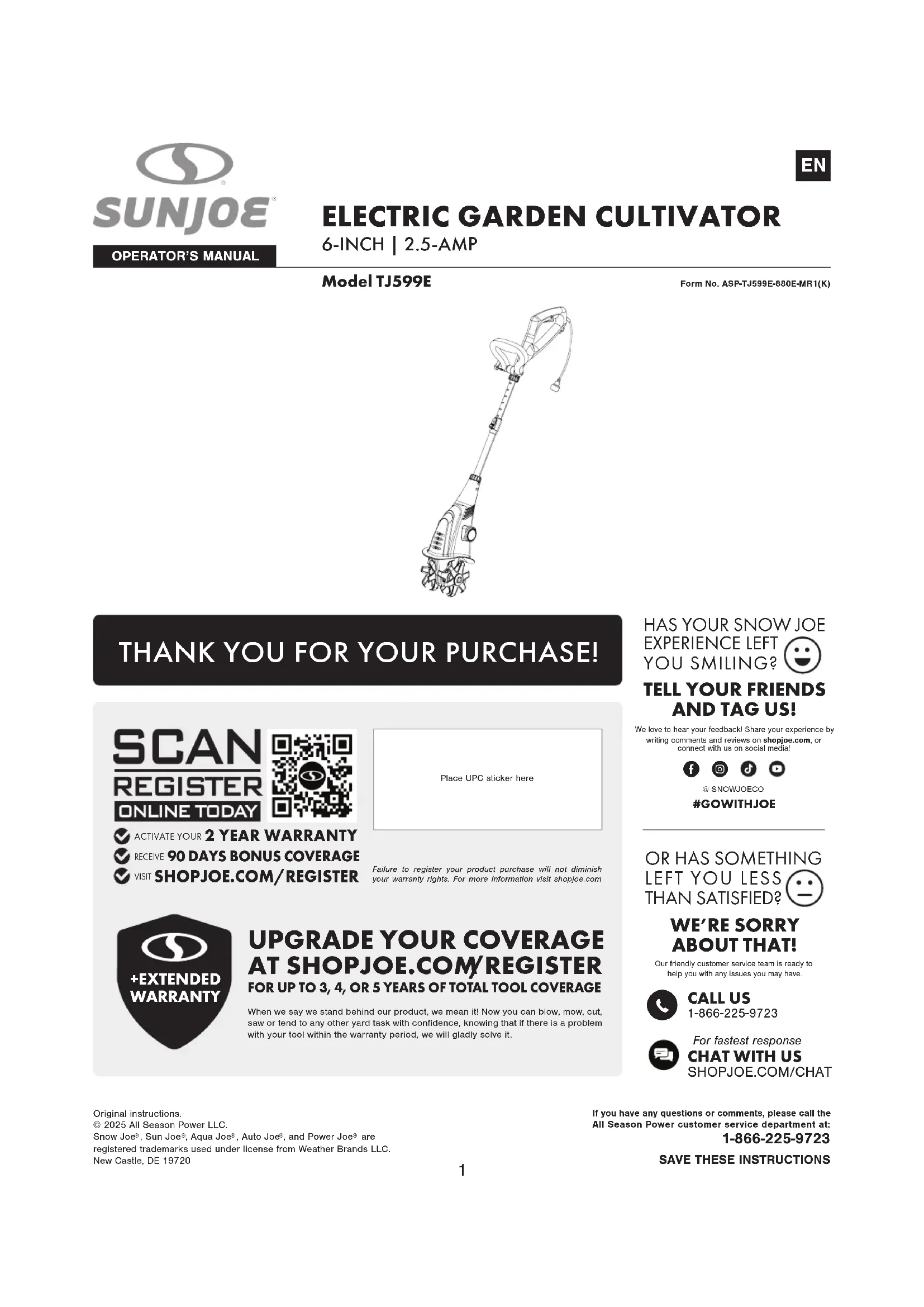 Instructions d’origine.© 2025 All Season Power, LLC.Snow Joe , Sun Joe , Aqua Joe , Auto Joe , et Power Joe sont des marques déposées utilisées sous licence de Weather Brands LLC.New Castle, DE 19720 NOUS SOMMES DÉSOLÉS POUR CELA! Notre équipe sympathique du service client est prête à vous aider avec tout problème que vous pourriez rencontrer.