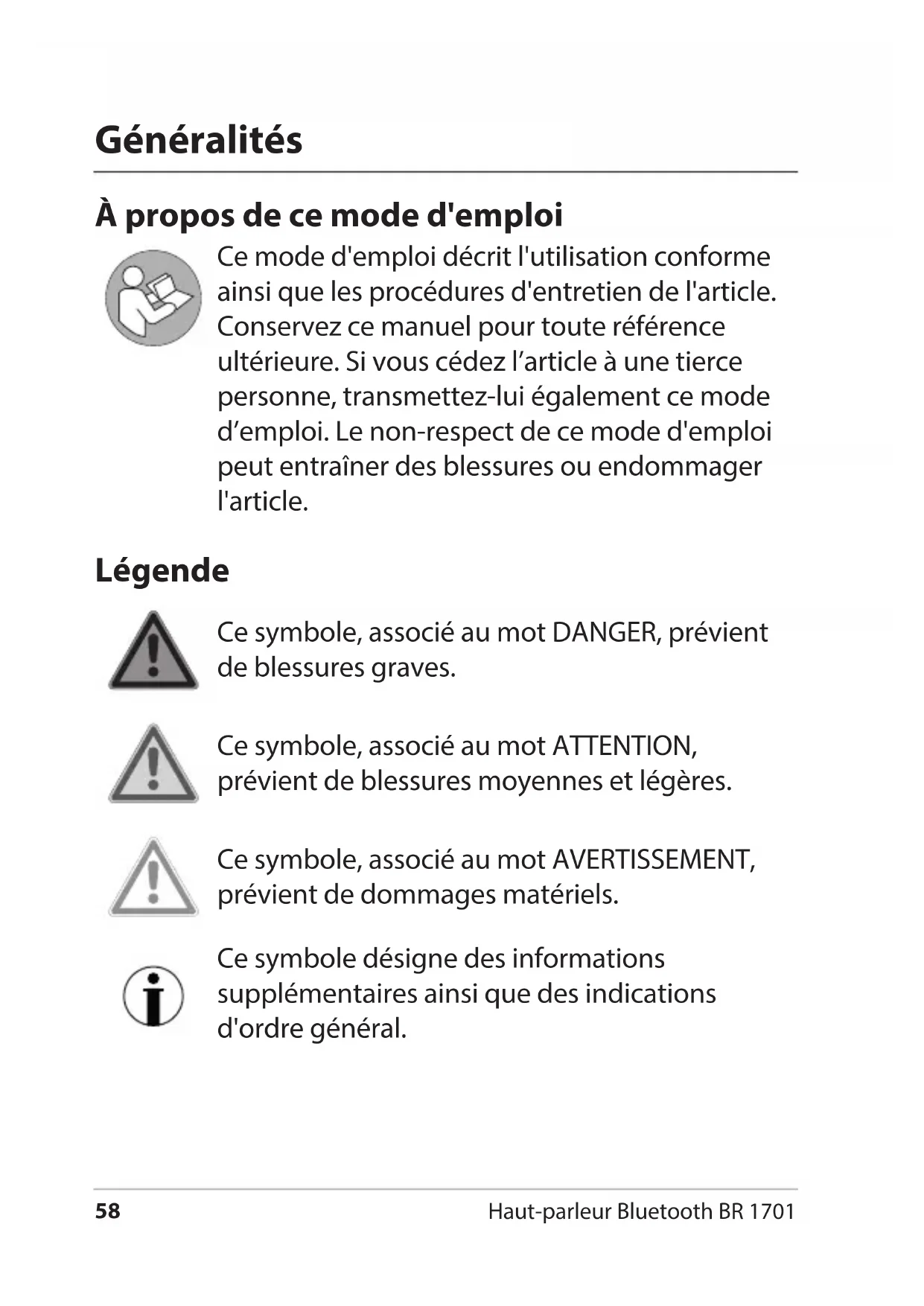 - Mise au rebut Haut-parleur Bluetooth BR 1701 Généralités À propos de ce mode d'emploi Ce mode d'emploi décrit l'utilisation conforme ainsi que les procédures d'entretien de l'article. Conservez ce manuel pour toute référence ultérieure. Si vous cédez l’article à une tierce personne, transmettez-lui également ce mode d’emploi. Le non-respect de ce mode d'emploi peut entraîner des blessures ou endommager l'article. Légende Ce symbole, associé au mot DANGER, prévient de blessures graves. Ce symbole, associé au mot ATTENTION, prévient de blessures moyennes et légères. Ce symbole, associé au mot AVERTISSEMENT, prévient de dommages matériels. Ce symbole désigne des informations supplémentaires ainsi que des indications d'ordre général.59 Haut-parleur Bluetooth BR 1701 Français Utilisation conforme Ce haut-parleur sert à la lecture audio par Bluetooth ou câble audio. L'appareil utilisé pour la lecture peut être par exemple un Smartphone, une tablette, un notebook ou un lecteur MP3. L’appareil ne convient pas à un usage commercial. Ce haut-parleur doit fonctionner dans des conditions climatiques modérées. Sécurité Les enfants ne doivent pas jouer avec cet article. Appareil équipé d'une batterie lithium- ion. Celle-ci ne doit pas être démontée, jetée au feu ou court-circuitée. Risque d'explosion! Protégez la batterie incorporée des fortes chaleurs. La batterie incorporée est inamovible. N'essayez pas de la remplacer ou de la démonter vous- même. Un démontage inapproprié de la batterie entraîne des risques d'explosion. Si la batterie est défectueuse, adressez-vous à notre service ou à un atelier spécialisé.60 Haut-parleur Bluetooth BR 1701 DANGER pour les enfants Les matériaux d’emballage doivent être maintenus hors de portée des enfants. Il existe un risque d'étouement en cas d'ingestion. RISQUE d’électrocution Ne modiez pas l'article ou le câble de raccordement. Conez exclusivement les réparations à un atelier spécialisé, car des réparations non conformes représentent un danger pour l'utilisateur. N'ouvrez pas le boîtier et n'enfoncez pas d'objets dans les ouvertures du boîtier. Ne posez aucun récipient rempli de liquide sur l’appareil ou à côté. Le récipient risquerait de se renverser, et le liquide écoulé représenterait un danger électrique. ATTENTION aux risques de brûlures/ incendies Ne faites pas fonctionner l'appareil à proximité de ammes nues (ex: bougies) et ne placez pas de bougies allumées sur ou à proximité de l'appareil. L'appareil peut chauer pendant qu'il charge. Installez l'appareil dans un emplacement susamment aéré avant de lancer la recharge, et ne le recouvrez pas.61 Haut-parleur Bluetooth BR 1701 Français Remarque sur les dangers matériels Le haut-parleur est protégé de l'humidité, mais ni lui ni les câbles fournis ne doivent être plongés dans l'eau ni dans tout autre liquide. Veillez à ce que l'appareil ne soit pas exposé à la saleté, à une forte humidité et à la lumière directe du soleil. Ne reliez pas le haut-parleur à la sortie de haut- parleur d'un amplicateur séparé. Cela risquerait d'endommager le haut-parleur. Lorsque le haut-parleur passe d'un endroit très froid à un endroit très chaud, de la condensation peut se former à l'intérieur. Attendez quelques secondes avant d'allumer le haut-parleur. N'approchez pas de cartes magnétisées (cartes d'identité, cartes de crédit etc.) de l'appareil. Les aimants internes du haut-parleur risqueraient de les endommager. N’utilisez en aucun cas de détergents corrosifs, abrasifs, agressifs ou autres pour nettoyer le haut- parleur. Cela pourrait rayer les surfaces. Le haut-parleur dispose de pieds sur le dessous. Les surfaces du sol étant composées des matériaux les plus divers et étant nettoyées avec les produits les plus variés, il n’est pas entièrement exclu que certains de ces matériaux contiennent des éléments qui peuvent attaquer et ramollir les pieds de l’appareil. Le cas échéant, disposez un support antidérapant sous le haut-parleur.62 Haut-parleur Bluetooth BR 1701 Vue d’ensemble 1 Commandes 2 Témoin Bluetooth 3 Mousqueton 4 Languette de fermeture en caoutchouc avec prises: AUX : Prise de connexion pour périphérique externe équipé d'un connecteur de 3,5mm (câble fourni) DC IN : Prise de connexion pour câble de recharge USB (câble fourni) 5 Pied de l'appareil 6 Haut-parleur p. 7258