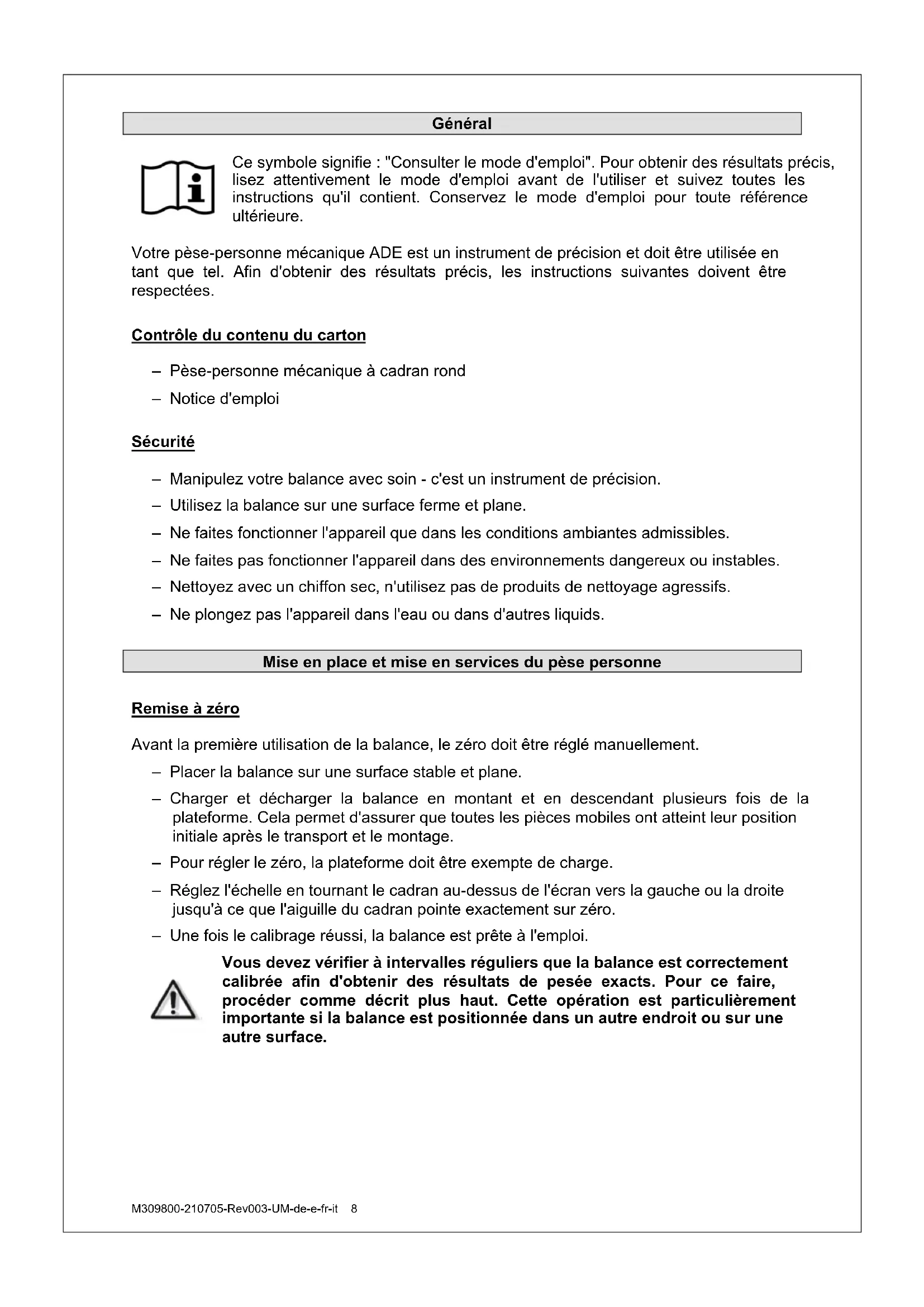 Votre pèse-personne mécanique ADE est un instrument de précision et doit être utilisée en tant que tel. Afin d'obtenir des résultats précis, les instructions suivantes doivent être respectées. Contrôle du contenu du carton – Pèse-personne mécanique à cadran rond – Notice d'emploi Sécurité – Manipulez votre balance avec soin - c'est un instrument de précision. – Utilisez la balance sur une surface ferme et plane. – Ne faites fonctionner l'appareil que dans les conditions ambiantes admissibles. – Ne faites pas fonctionner l'appareil dans des environnements dangereux ou instables. – Nettoyez avec un chiffon sec, n'utilisez pas de produits de nettoyage agressifs. – Ne plongez pas l'appareil dans l'eau ou dans d'autres liquids. Mise en place et mise en services du pèse personne Remise à zéro Avant la première utilisation de la balance, le zéro doit être réglé manuellement. – Placer la balance sur une surface stable et plane. – Charger et décharger la balance en montant et en descendant plusieurs fois de la plateforme. Cela permet d'assurer que toutes les pièces mobiles ont atteint leur position initiale après le transport et le montage. – Pour régler le zéro, la plateforme doit être exempte de charge. – Réglez l'échelle en tournant le cadran au-dessus de l'écran vers la gauche ou la droite jusqu'à ce que l'aiguille du cadran pointe exactement sur zéro. – Une fois le calibrage réussi, la balance est prête à l'emploi. Vous devez vérifier à intervalles réguliers que la balance est correctement calibrée afin d'obtenir des résultats de pesée exacts. Pour ce faire, procéder comme décrit plus haut. Cette opération est particulièrement importante si la balance est positionnée dans un autre endroit ou sur une autre surface .9 M309800-210705-Rev003-UM-de-e-fr-it Pesage – Montez sur le plateau de la balance. – Veillez à placer vos pieds au centre de la plate-forme. Les distances entre vos pieds et les bords de la plate-forme doivent être plus ou moins les mêmes de tous les côtés. Essayez de ne pas bouger. – Attendez que l'aiguille cesse de bouger. L'aiguille tremblera toujours un peu car il est impossible de rester absolument immobile sur la plate-forme. Toutefois, l'erreur est minime. Vous pouvez être sûr d'avoir un résultat suffisamment précis à tout moment. Remarque: Pour obtenir des résultats statistiques fiables, prenez votre poids tous les jours à la même heure. Soin et entretien Nettoyage N’utilisez pas de produits de nettoyage chimiques ou de détergents agressifs, ne pas nettoyer à grande eau. Nettoyez l’appareil à l’aide d’un chiffon doux imbibé d’une solution savonneuse suivi d’un rinçage et d’un essuyage méticuleux. Garantie ADE réparera ou remplacera ce produit s’il est prouvé qu’il a mal fonctionné dans un laps de temps de deux ans depuis la date de vente (la preuve d’achat est nécessaire). Les parties amovibles telles que les batteries, les câbles, les adaptateurs secteur, les piles, etc. sont exclues de la garantie. Cette garantie ne couvre ni l’usure extérieure normale ni les dommages dus à des accidents naturels ou ceux causés par une utilisation abusive. La garantie est nulle pour les appareils qui ont été ouverts sans autorisation. En cas de retour du matériel, le matériel doit être conditionné dans son emballage d’origine, les frais de transport sont à la charge de l’utilisateur. En cas de problème, vous devez contacter le revendeur chez lequel vous avez acheté le matériel, que ce soit pour un problème de garantie, pour l’achat de pièces détachées ou pour révision et réparation.M309800-210705-Rev003-UM-de-e-fr-it 10 Données techniques Capacité maximale : 150 kg Graduation : 500 g Dimensions : 320 x 70 x 435 mm Poids : environ 2,8 kg Matériel de logement : métal Visibilité très confortable sur grand cadran Tapis antidérapant Déclaration de conformité
