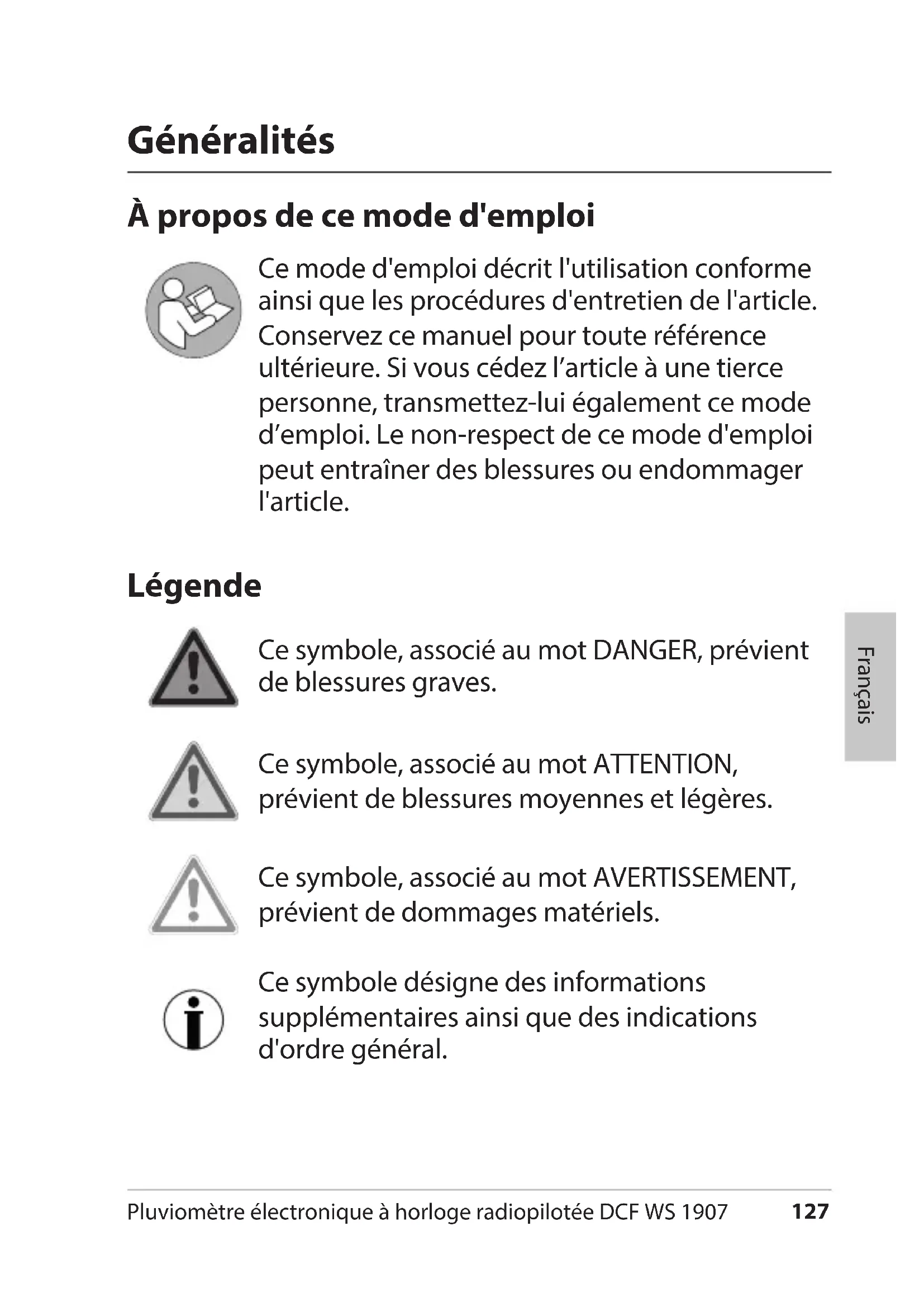 - Mise au rebut 27 Pluviomètre électronique à horloge radiopilotée DCF WS 1907 Français Généralités À propos de ce mode d'emploi Ce mode d'emploi décrit l'utilisation conforme ainsi que les procédures d'entretien de l'article. Conservez ce manuel pour toute référence ultérieure. Si vous cédez l’article à une tierce personne, transmettez-lui également ce mode d’emploi. Le non-respect de ce mode d'emploi peut entraîner des blessures ou endommager l'article. Légende Ce symbole, associé au mot DANGER, prévient de blessures graves. Ce symbole, associé au mot ATTENTION, prévient de blessures moyennes et légères. Ce symbole, associé au mot AVERTISSEMENT, prévient de dommages matériels. Ce symbole désigne des informations supplémentaires ainsi que des indications d'ordre général.128 Pluviomètre électronique à horloge radiopilotée DCF WS 1907 Utilisation conforme Cet appareil (composé d'une station de base et d’un pluviomètre sans fil) fournit les données météorologiques de l’environnement le plus proche. Sur la base des données météorologiques obtenues, la station de base détermine une tendance. L’appareil mesure également la quantité de précipitations. La station de base indique en outre la date et l’heure et dispose également d'une fonction de réveil. La station de base n’est pas adaptée à une utilisation commerciale dans le domaine de la précision météorologique ou de la mesure des données météorologiques. Sécurité Cet appareil peut être utilisé par des enfants dès l'âge de 8 ans ainsi que par des personnes aux capacités physiques, sensorielles ou mentales limitées ou de peu d'expérience et/ou de connaissances si ceux-ci sont sous surveillance ou ont été instruits de l'utilisation conforme de l'article et comprennent les risques qui en découlent. Les enfants ne doivent pas jouer avec cet article.129 Pluviomètre électronique à horloge radiopilotée DCF WS 1907 Français Le nettoyage et l’entretien ne doivent pas être réalisés par des enfants, à moins qu’ils aient 8ans révolus et soient sous surveillance. Les piles peuvent être dangereuses pour la santé en cas d’ingestion. Par conséquent, tenez l’appareil et les piles hors de portée des enfants. En cas d'ingestion d'une pile, sollicitez immédiatement une aide médicale. Danger pour les enfants Tenez les enfants éloignés des matériaux d'emballage et des petits éléments faisant partie du contenu de l'emballage. Il existe un risque d'étouffement en cas d'ingestion. DANGER d’incendie/brûlure et/ou d’explosion Risque d’explosion en cas de remplacement non conforme des piles. Remplacez les piles uniquement par des piles similaires ou un type de pile équivalent. Respectez les indications des «Caractéristiques techniques». Les piles ne doivent pas être chargées, réactivées avec d’autres moyens, démontées, jetées au feu ou court-circuitées. Dans le cas contraire, il existe un risque élevé d'explosion et de fuite, ainsi que d’échappement de gaz!130 Pluviomètre électronique à horloge radiopilotée DCF WS 1907 Évitez tout contact de la peau, des yeux et des muqueuses avec le liquide des piles. En cas de contact, rincez immédiatement et abondamment les zones concernées à l’eau claire et consultez un médecin. AVERTISSEMENT sur les dommages matériels Protégez la station de base de la poussière, des chocs, des températures extrêmes, de l’humidité et de la lumière directe du soleil. Installez la station de base exclusivement dans une pièce sèche et fermée. Retirez les piles de la station de base et du pluviomètre lorsqu’elles sont usées ou si vous n'utilisez pas la station de base pendant une période prolongée. Vous éviterez ainsi les dommages qui pourraient résulter d’une fuite des piles. N’exposez pas les piles à des conditions extrêmes, en les conservant par exemple sur une source de chaleur ou à la lumière directe du soleil. Risque accru de fuite pour les piles! Si nécessaire, nettoyez les bornes des piles et les contacteurs de l'appareil avant l'insertion. Changez toujours toutes les piles en même temps. N'employez que des piles d’un même type, ne mélangez pas des types de piles différents, ni des piles usées et des piles neuves. N’apportez aucune modification à l’appareil. Confiez exclusivement les réparations à un atelier spécialisé et respectez les conditions de garantie.131 Pluviomètre électronique à horloge radiopilotée DCF WS 1907 Français Pour le nettoyage de la station de base, n’utilisez en aucun cas des produits agressifs, abrasifs ou similaires. Cela pourrait rayer les surfaces. Les fonctions de l’appareil Mesure et affichage de la pluviométrie actuelle Calcul et historique de la pluviométrie sur plusieurs périodes et affichage de la pluviométrie totale Pluviométrie en mm ou en pouces Affichage de la température en °C ou en °F Affichage de la température intérieure et extérieure avec affichage des tendances et fonction mémoire Horloge radiopilotée (signal horaire DCF) à réglage manuel Réveil avec double alarme et fonction de répétition Calendrier perpétuel avec indication de la date et du jour Grand écran LCD clair132 Pluviomètre électronique à horloge radiopilotée DCF WS 1907 Station de base Face avant avec écran p. 1631