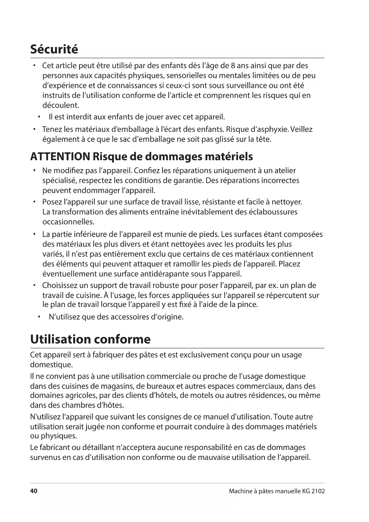 Machine à pâtes manuelle KG 2102 Sécurité Cet article peut être utilisé par des enfants dès l’âge de 8ans ainsi que par des personnes aux capacités physiques, sensorielles ou mentales limitées ou de peu d’expérience et de connaissances si ceux-ci sont sous surveillance ou ont été instruits de l’utilisation conforme de l’article et comprennent les risques qui en découlent. Il est interdit aux enfants de jouer avec cet appareil. Tenez les matériaux d’emballage à l’écart des enfants. Risque d’asphyxie. Veillez également à ce que le sac d’emballage ne soit pas glissé sur la tête. ATTENTION Risque de dommages matériels Ne modiez pas l’appareil. Conez les réparations uniquement à un atelier spécialisé, respectez les conditions de garantie. Des réparations incorrectes peuvent endommager l’appareil. Posez l’appareil sur une surface de travail lisse, résistante et facile à nettoyer. La transformation des aliments entraîne inévitablement des éclaboussures occasionnelles. La partie inférieure de l’appareil est munie de pieds. Les surfaces étant composées des matériaux les plus divers et étant nettoyées avec les produits les plus variés, il n'est pas entièrement exclu que certains de ces matériaux contiennent des éléments qui peuvent attaquer et ramollir les pieds de l'appareil. Placez éventuellement une surface antidérapante sous l’appareil. Choisissez un support de travail robuste pour poser l’appareil, parex. un plan de travail de cuisine. À l’usage, les forces appliquées sur l’appareil se répercutent sur le plan de travail lorsque l’appareil y est xé à l’aide de la pince. N’utilisez que des accessoires d’origine. Utilisation conforme Cet appareil sert à fabriquer des pâtes et est exclusivement conçu pour un usage domestique. Il ne convient pas à une utilisation commerciale ou proche de l’usage domestique dans des cuisines de magasins, de bureaux et autres espaces commerciaux, dans des domaines agricoles, par des clients d’hôtels, de motels ou autres résidences, ou même dans des chambres d’hôtes. N'utilisez l’appareil que suivant les consignes de ce manuel d'utilisation. Toute autre utilisation serait jugée non conforme et pourrait conduire à des dommages matériels ou physiques. Le fabricant ou détaillant n’acceptera aucune responsabilité en cas de dommages survenus en cas d’utilisation non conforme ou de mauvaise utilisation de l’appareil.Aperçu