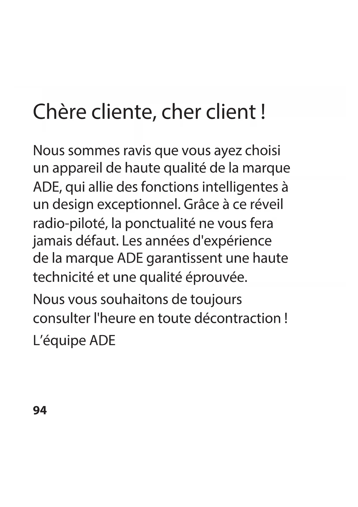 Nous sommes ravis que vous ayez choisi un appareil de haute qualité de la marque ADE, qui allie des fonctions intelligentes à un design exceptionnel. Grâce à ce réveil radio-piloté, la ponctualité ne vous fera jamais défaut. Les années d'expérience de la marque ADE garantissent une haute technicité et une qualité éprouvée.