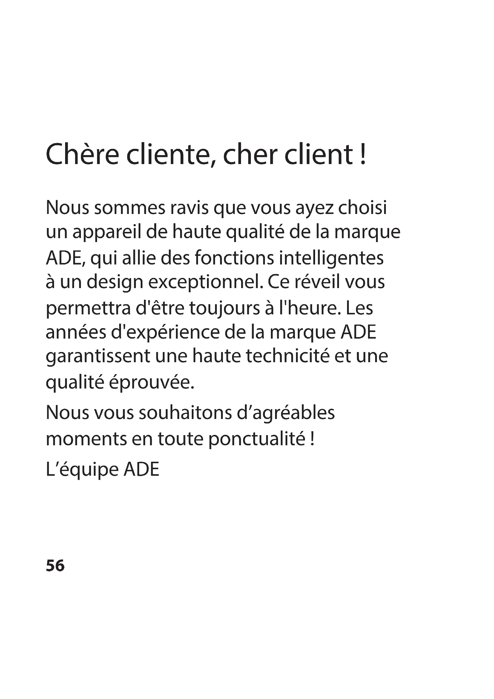 À la fin de sa durée de vie, l'article doit être soumis à une élimination contrôlée. Ainsi, les matières utiles contenues dans l'appareil pourront être recyclées, avec un moindre impact sur l'environnement. Déposez l'appareil usagé dans un point de collecte pour les déchets électroniques ou dans un centre de recyclage. Pour plus d’informations, adressez-vous à votre service de collecte local ou à votre municipalité. Les piles et batteries ne doivent pas être éliminées avec les déchets ménagers Toutes les piles et batteries doivent être déposées dans un point de collecte de votre localité ou rapportées à leur point d’achat. Les piles et batteries seront ainsi traitées dans le respect de l'environnement.74 Gentile cliente! La ringraziamo per aver scelto un prodotto di alta qualità della ADE che unisce funzioni intelligenti e un design fuori dal comune. Con questa sveglia si ha costantemente sotto controllo l'ora esatta. La lunga esperienza della ADE garantisce standard tecnici elevati e qualità consolidata. Auguriamo un tempismo rilassato in qualsiasi momento! Il Suo team ADE75