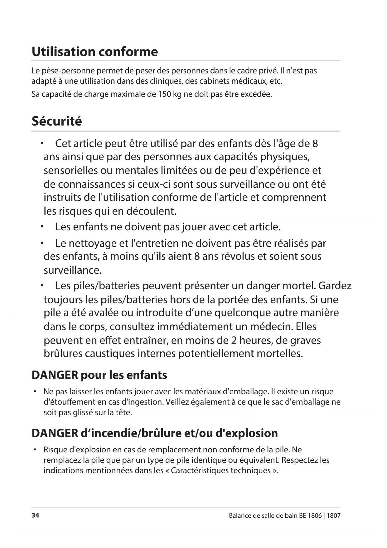 Balance de salle de bain BE 1806 | 1807 Utilisation conforme Le pèse-personne permet de peser des personnes dans le cadre privé. Il n'est pas adapté à une utilisation dans des cliniques, des cabinets médicaux, etc. Sa capacité de charge maximale de 150kg ne doit pas être excédée. Sécurité Cet article peut être utilisé par des enfants dès l'âge de 8 ans ainsi que par des personnes aux capacités physiques, sensorielles ou mentales limitées ou de peu d'expérience et de connaissances si ceux-ci sont sous surveillance ou ont été instruits de l'utilisation conforme de l'article et comprennent les risques qui en découlent. Les enfants ne doivent pas jouer avec cet article. Le nettoyage et l'entretien ne doivent pas être réalisés par des enfants, à moins qu'ils aient 8 ans révolus et soient sous surveillance. Les piles/batteries peuvent présenter un danger mortel. Gardez toujours les piles/batteries hors de la portée des enfants. Si une pile a été avalée ou introduite d’une quelconque autre manière dans le corps, consultez immédiatement un médecin. Elles peuvent en eet entraîner, en moins de 2heures, de graves brûlures caustiques internes potentiellement mortelles. DANGER pour les enfants Ne pas laisser les enfants jouer avec les matériaux d'emballage. Il existe un risque d'étouement en cas d'ingestion. Veillez également à ce que le sac d'emballage ne soit pas glissé sur la tête. DANGER d’incendie/brûlure et/ou d'explosion Risque d'explosion en cas de remplacement non conforme de la pile. Ne remplacez la pile que par un type de pile identique ou équivalent. Respectez les indications mentionnées dans les «Caractéristiques techniques».Sécurité