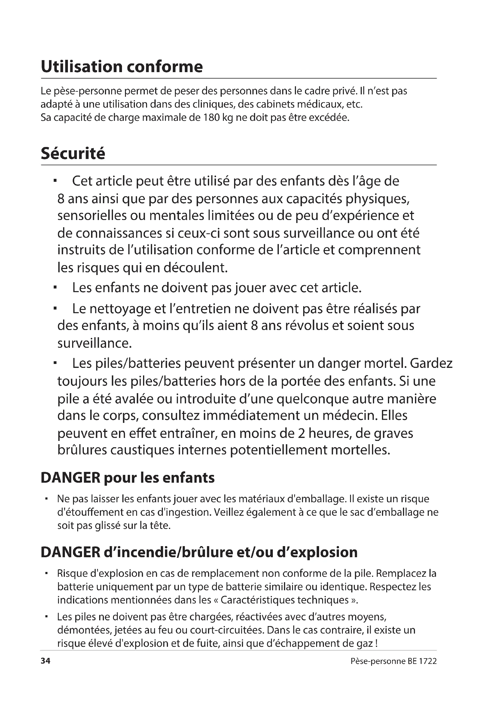 Pèse-personne BE 1722 Utilisation conforme Le pèse-personne permet de peser des personnes dans le cadre privé. Il n’est pas adapté à une utilisation dans des cliniques, des cabinets médicaux, etc. Sa capacité de charge maximale de 180kg ne doit pas être excédée. Sécurité Cet article peut être utilisé par des enfants dès l’âge de 8ans ainsi que par des personnes aux capacités physiques, sensorielles ou mentales limitées ou de peu d’expérience et de connaissances si ceux-ci sont sous surveillance ou ont été instruits de l’utilisation conforme de l’article et comprennent les risques qui en découlent. Les enfants ne doivent pas jouer avec cet article. Le nettoyage et l’entretien ne doivent pas être réalisés par des enfants, à moins qu’ils aient 8 ans révolus et soient sous surveillance. Les piles/batteries peuvent présenter un danger mortel. Gardez toujours les piles/batteries hors de la portée des enfants. Si une pile a été avalée ou introduite d’une quelconque autre manière dans le corps, consultez immédiatement un médecin. Elles peuvent en eet entraîner, en moins de 2heures, de graves brûlures caustiques internes potentiellement mortelles. DANGER pour les enfants Ne pas laisser les enfants jouer avec les matériaux d'emballage. Il existe un risque d'étouement en cas d'ingestion. Veillez également à ce que le sac d’emballage ne soit pas glissé sur la tête. DANGER d’incendie/brûlure et/ou d’explosion Risque d'explosion en cas de remplacement non conforme de la pile. Remplacez la batterie uniquement par un type de batterie similaire ou identique. Respectez les indications mentionnées dans les «Caractéristiques techniques». Les piles ne doivent pas être chargées, réactivées avec d’autres moyens, démontées, jetées au feu ou court-circuitées. Dans le cas contraire, il existe un risque élevé d'explosion et de fuite, ainsi que d’échappement de gaz!Sécurité