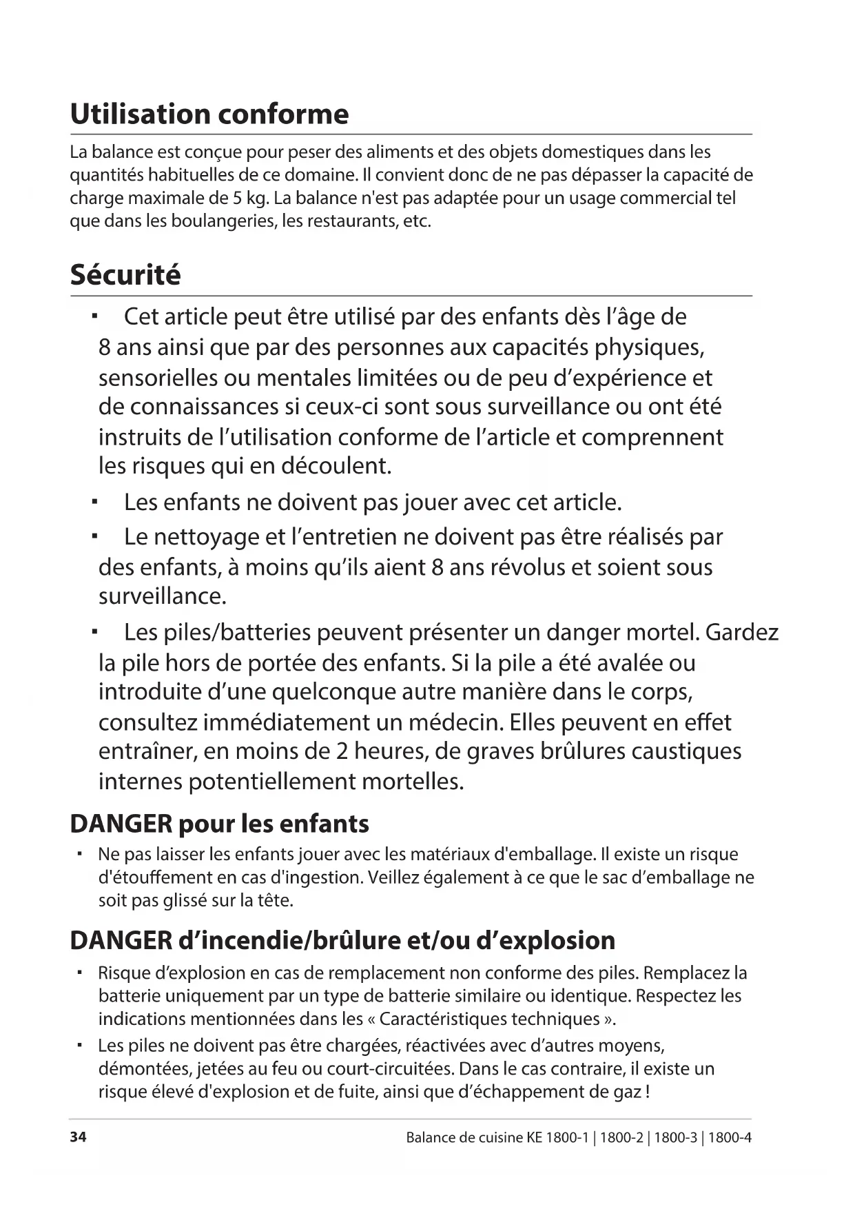 Balance de cuisine KE 1800-1 | 1800-2 | 1800-3 | 1800-4 Utilisation conforme La balance est conçue pour peser des aliments et des objets domestiques dans les quantités habituelles de ce domaine. Il convient donc de ne pas dépasser la capacité de charge maximale de 5 kg. La balance n'est pas adaptée pour un usage commercial tel que dans les boulangeries, les restaurants, etc. Sécurité Cet article peut être utilisé par des enfants dès l’âge de 8ans ainsi que par des personnes aux capacités physiques, sensorielles ou mentales limitées ou de peu d’expérience et de connaissances si ceux-ci sont sous surveillance ou ont été instruits de l’utilisation conforme de l’article et comprennent les risques qui en découlent. Les enfants ne doivent pas jouer avec cet article. Le nettoyage et l’entretien ne doivent pas être réalisés par des enfants, à moins qu’ils aient 8 ans révolus et soient sous surveillance. Les piles/batteries peuvent présenter un danger mortel. Gardez la pile hors de portée des enfants. Si la pile a été avalée ou introduite d’une quelconque autre manière dans le corps, consultez immédiatement un médecin. Elles peuvent en eet entraîner, en moins de 2heures, de graves brûlures caustiques internes potentiellement mortelles. DANGER pour les enfants Ne pas laisser les enfants jouer avec les matériaux d'emballage. Il existe un risque d'étouement en cas d'ingestion. Veillez également à ce que le sac d’emballage ne soit pas glissé sur la tête. DANGER d’incendie/brûlure et/ou d’explosion Risque d’explosion en cas de remplacement non conforme des piles. Remplacez la batterie uniquement par un type de batterie similaire ou identique. Respectez les indications mentionnées dans les «Caractéristiques techniques». Les piles ne doivent pas être chargées, réactivées avec d’autres moyens, démontées, jetées au feu ou court-circuitées. Dans le cas contraire, il existe un risque élevé d'explosion et de fuite, ainsi que d’échappement de gaz!Sécurité