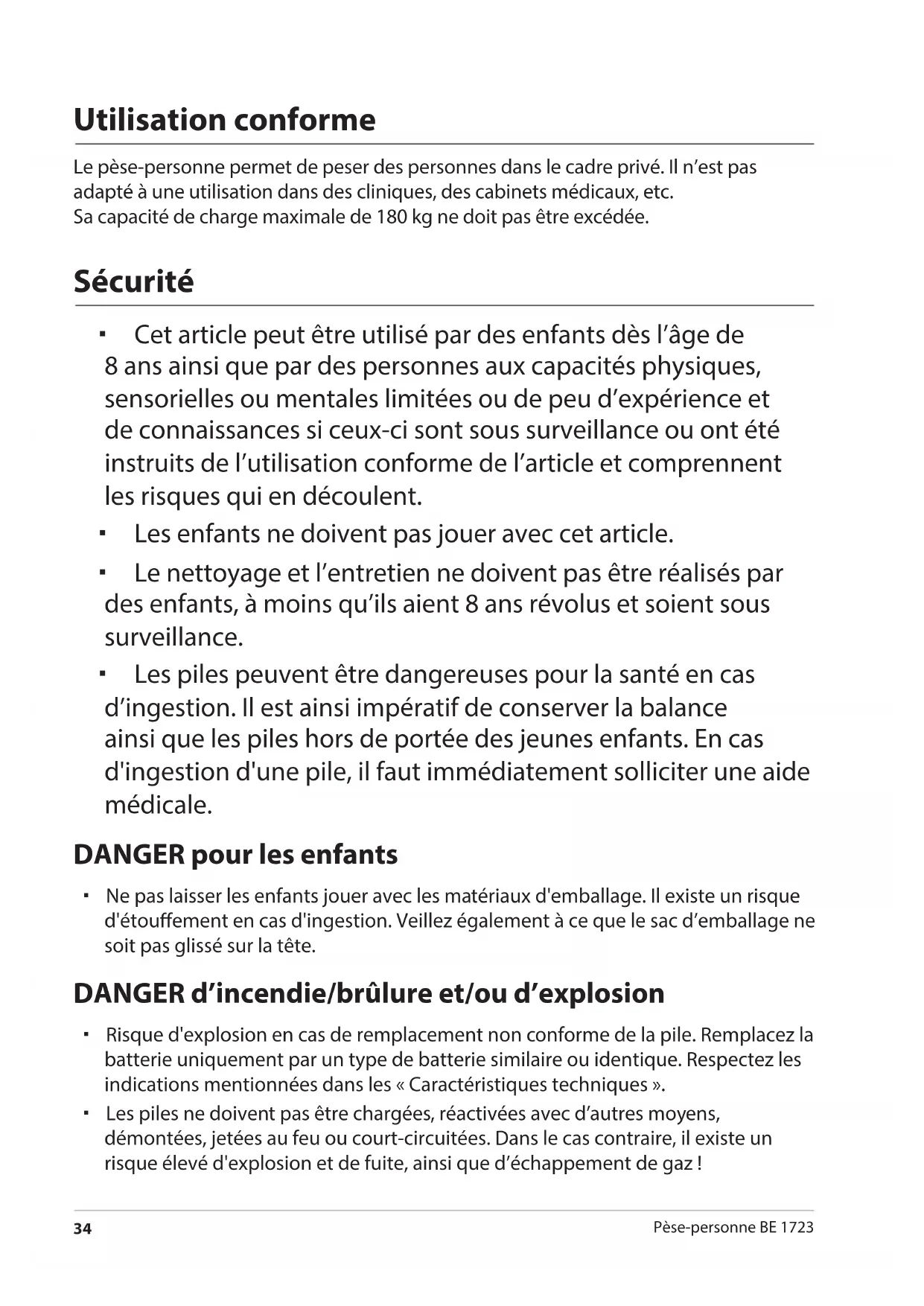 Pèse-personne BE 1723 Utilisation conforme Le pèse-personne permet de peser des personnes dans le cadre privé. Il n’est pas adapté à une utilisation dans des cliniques, des cabinets médicaux, etc. Sa capacité de charge maximale de 180kg ne doit pas être excédée. Sécurité Cet article peut être utilisé par des enfants dès l’âge de 8ans ainsi que par des personnes aux capacités physiques, sensorielles ou mentales limitées ou de peu d’expérience et de connaissances si ceux-ci sont sous surveillance ou ont été instruits de l’utilisation conforme de l’article et comprennent les risques qui en découlent. Les enfants ne doivent pas jouer avec cet article. Le nettoyage et l’entretien ne doivent pas être réalisés par des enfants, à moins qu’ils aient 8 ans révolus et soient sous surveillance. Les piles peuvent être dangereuses pour la santé en cas d’ingestion. Il est ainsi impératif de conserver la balance ainsi que les piles hors de portée des jeunes enfants. En cas d'ingestion d'une pile, il faut immédiatement solliciter une aide médicale. DANGER pour les enfants Ne pas laisser les enfants jouer avec les matériaux d'emballage. Il existe un risque d'étouement en cas d'ingestion. Veillez également à ce que le sac d’emballage ne soit pas glissé sur la tête. DANGER d’incendie/brûlure et/ou d’explosion Risque d'explosion en cas de remplacement non conforme de la pile. Remplacez la batterie uniquement par un type de batterie similaire ou identique. Respectez les indications mentionnées dans les «Caractéristiques techniques». Les piles ne doivent pas être chargées, réactivées avec d’autres moyens, démontées, jetées au feu ou court-circuitées. Dans le cas contraire, il existe un risque élevé d'explosion et de fuite, ainsi que d’échappement de gaz! Koerperwaage BE 1723.indb 34 15.01.2018 10:17:13Sécurité