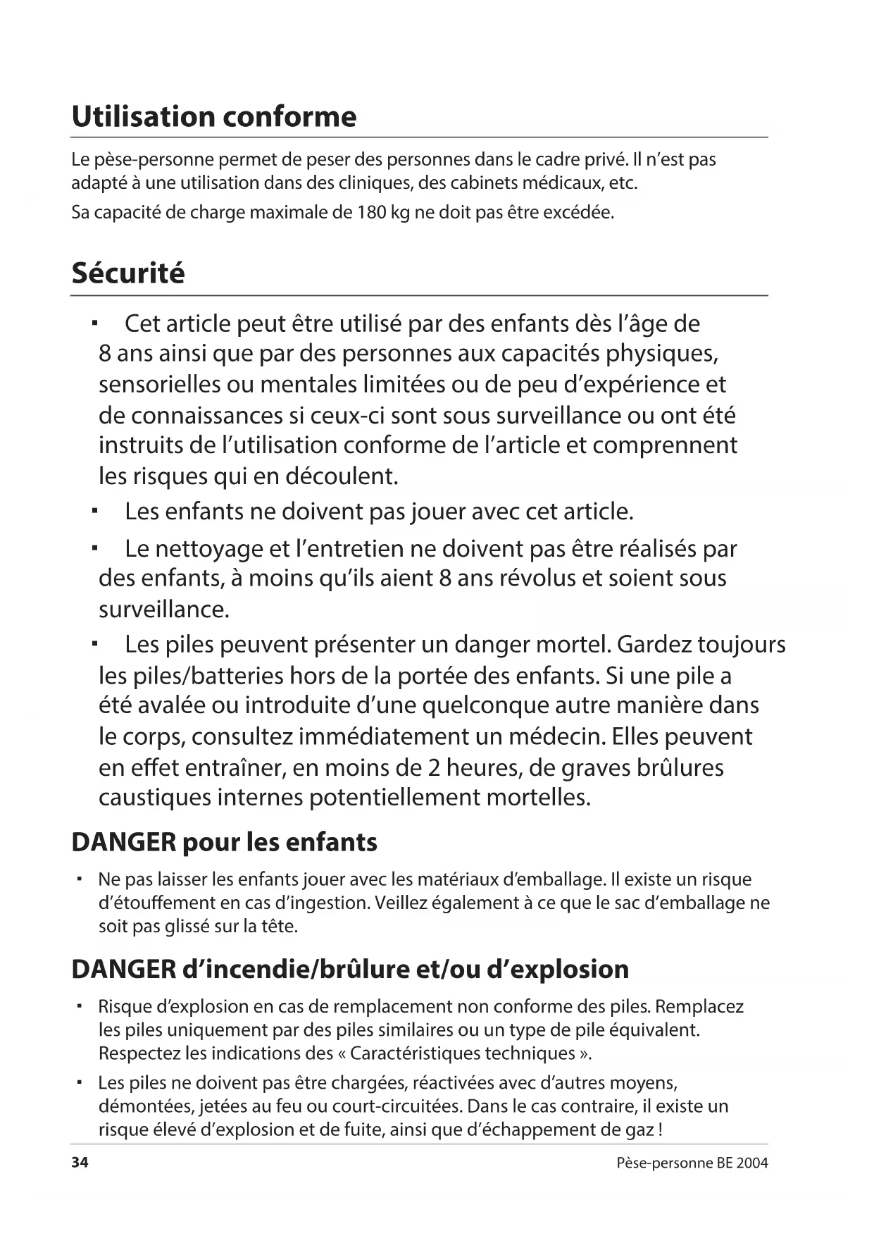 Pèse-personne BE 2004 Utilisation conforme Le pèse-personne permet de peser des personnes dans le cadre privé. Il n’est pas adapté à une utilisation dans des cliniques, des cabinets médicaux, etc. Sa capacité de charge maximale de 180kg ne doit pas être excédée. Sécurité Cet article peut être utilisé par des enfants dès l’âge de 8ans ainsi que par des personnes aux capacités physiques, sensorielles ou mentales limitées ou de peu d’expérience et de connaissances si ceux-ci sont sous surveillance ou ont été instruits de l’utilisation conforme de l’article et comprennent les risques qui en découlent. Les enfants ne doivent pas jouer avec cet article. Le nettoyage et l’entretien ne doivent pas être réalisés par des enfants, à moins qu’ils aient 8ans révolus et soient sous surveillance. Les piles peuvent présenter un danger mortel. Gardez toujours les piles/batteries hors de la portée des enfants. Si une pile a été avalée ou introduite d’une quelconque autre manière dans le corps, consultez immédiatement un médecin. Elles peuvent en eet entraîner, en moins de 2heures, de graves brûlures caustiques internes potentiellement mortelles. DANGER pour les enfants Ne pas laisser les enfants jouer avec les matériaux d’emballage. Il existe un risque d’étouement en cas d’ingestion. Veillez également à ce que le sac d’emballage ne soit pas glissé sur la tête. DANGER d’incendie/brûlure et/ou d’explosion Risque d’explosion en cas de remplacement non conforme des piles. Remplacez les piles uniquement par des piles similaires ou un type de pile équivalent. Respectez les indications des «Caractéristiques techniques». Les piles ne doivent pas être chargées, réactivées avec d’autres moyens, démontées, jetées au feu ou court-circuitées. Dans le cas contraire, il existe un risque élevé d’explosion et de fuite, ainsi que d’échappement de gaz!Sécurité