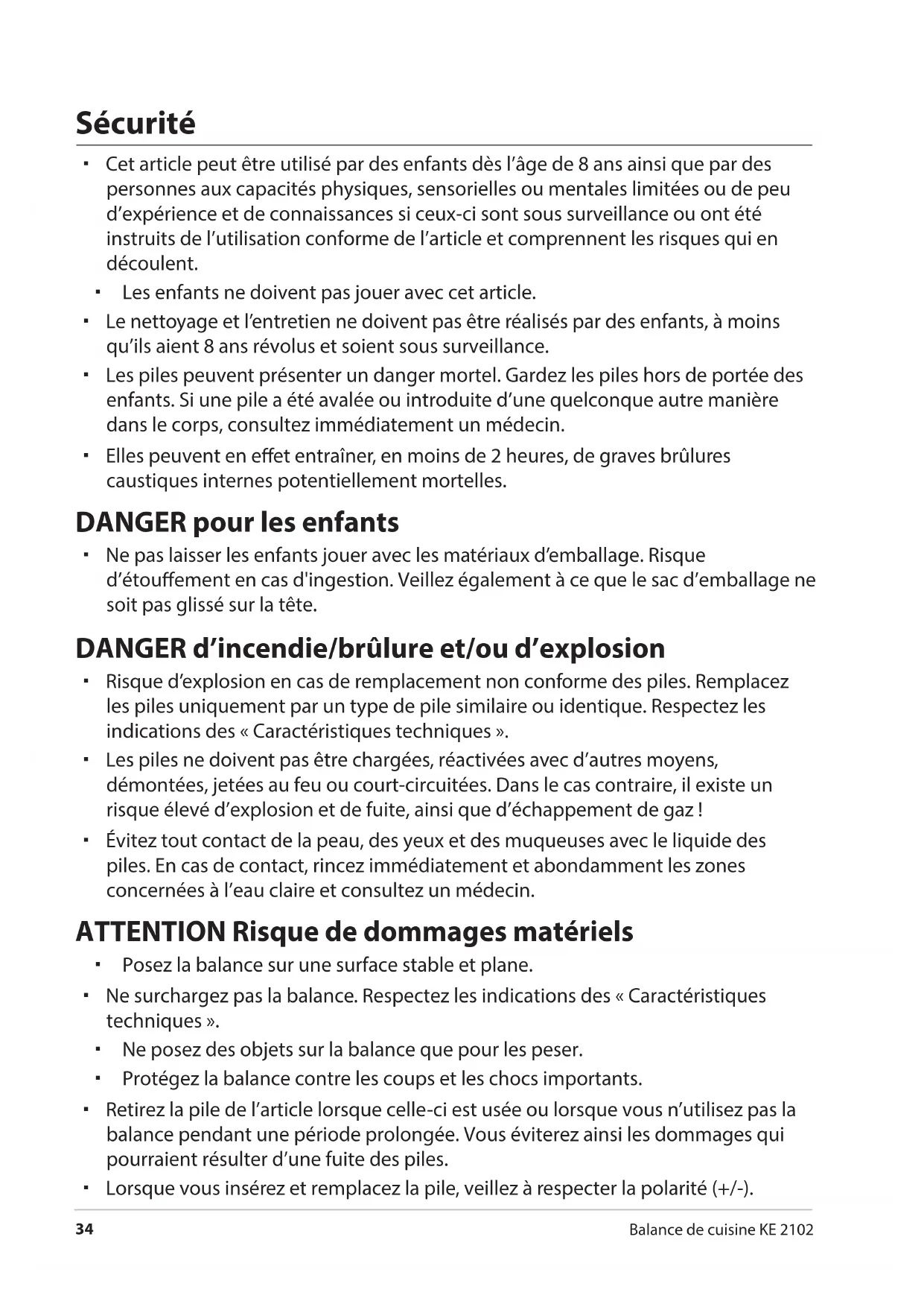 Balance de cuisine KE 2102 Sécurité Cet article peut être utilisé par des enfants dès l’âge de 8ans ainsi que par des personnes aux capacités physiques, sensorielles ou mentales limitées ou de peu d’expérience et de connaissances si ceux-ci sont sous surveillance ou ont été instruits de l’utilisation conforme de l’article et comprennent les risques qui en découlent. Les enfants ne doivent pas jouer avec cet article. Le nettoyage et l’entretien ne doivent pas être réalisés par des enfants, à moins qu’ils aient 8ans révolus et soient sous surveillance. Les piles peuvent présenter un danger mortel. Gardez les piles hors de portée des enfants. Si une pile a été avalée ou introduite d’une quelconque autre manière dans le corps, consultez immédiatement un médecin. Elles peuvent en eet entraîner, en moins de 2heures, de graves brûlures caustiques internes potentiellement mortelles. DANGER pour les enfants Ne pas laisser les enfants jouer avec les matériaux d’emballage. Risque d’étouement en cas d'ingestion. Veillez également à ce que le sac d’emballage ne soit pas glissé sur la tête. DANGER d’incendie/brûlure et/ou d’explosion Risque d’explosion en cas de remplacement non conforme des piles. Remplacez les piles uniquement par un type de pile similaire ou identique. Respectez les indications des «Caractéristiques techniques». Les piles ne doivent pas être chargées, réactivées avec d’autres moyens, démontées, jetées au feu ou court-circuitées. Dans le cas contraire, il existe un risque élevé d’explosion et de fuite, ainsi que d’échappement de gaz! Évitez tout contact de la peau, des yeux et des muqueuses avec le liquide des piles. En cas de contact, rincez immédiatement et abondamment les zones concernées à l’eau claire et consultez un médecin. ATTENTION Risque de dommages matériels Posez la balance sur une surface stable et plane. Ne surchargez pas la balance. Respectez les indications des «Caractéristiques techniques». Ne posez des objets sur la balance que pour les peser. Protégez la balance contre les coups et les chocs importants. Retirez la pile de l’article lorsque celle-ci est usée ou lorsque vous n’utilisez pas la balance pendant une période prolongée. Vous éviterez ainsi les dommages qui pourraient résulter d’une fuite des piles. Lorsque vous insérez et remplacez la pile, veillez à respecter la polarité(+/-).Utilisation conforme