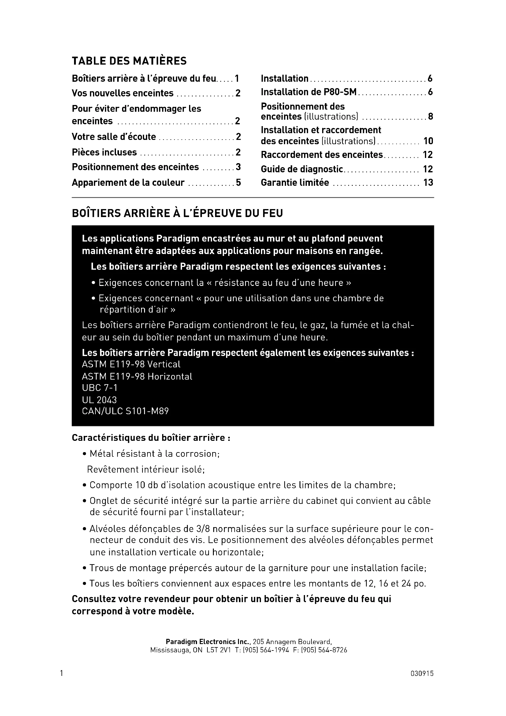 - Exigences concernant « pour une utilisation dans une chambre de répartition d’air » Les boîtiers arrière Paradigm contiendront le feu, le gaz, la fumée et la chal- eur au sein du boîtier pendant un maximum d’une heure. Les boîtiers arrière Paradigm respectent également les exigences suivantes : ASTM E119-98 Vertical ASTM E119-98 Horizontal UBC 7-1 UL 2043