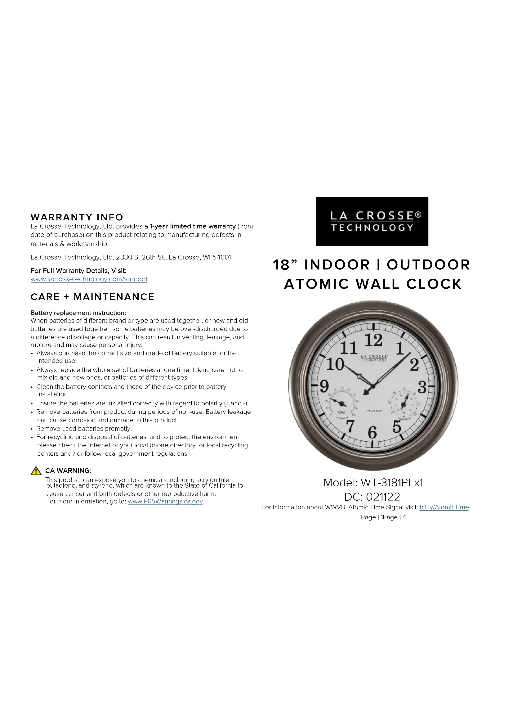 WT3181PLX1 - Horloge LA CROSSE TECHNOLOGY - Notice d'utilisation et mode d'emploi gratuit