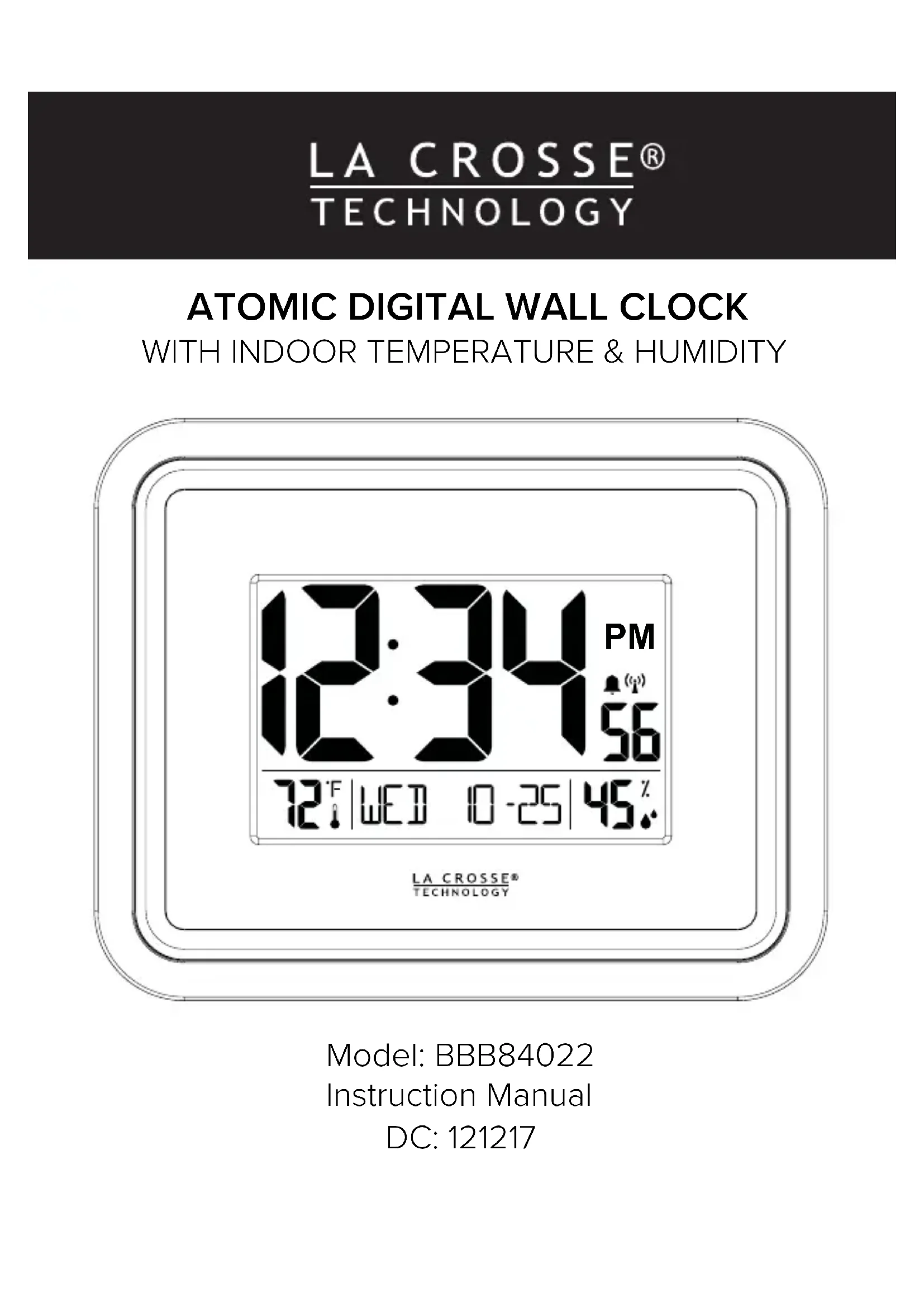 - Votre horloge restera à l’option d’achage sélectionnée. Page | 1 www.lacrossetechnology.com/support BBB84022 Achage de la date sélectionnable Commençons Paramètres de base Signal de temps atomique - WWVB Alarme temporelle Activer | Désactiver l’alarme Roupillon Pile faible Soyons socials Entretien et maintenance Spécifications Garantie et support Déclaration de la FCC