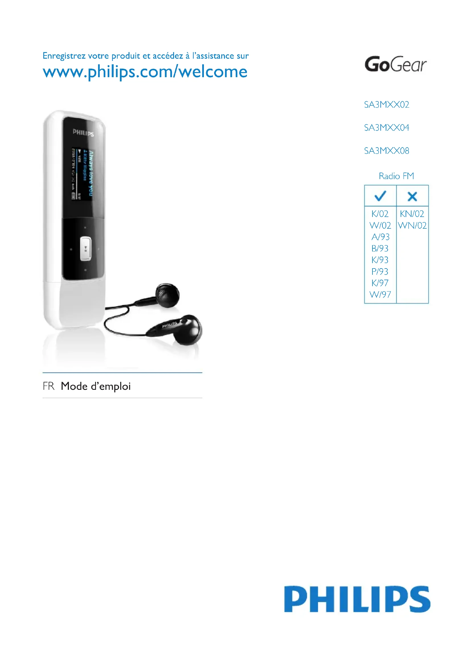 SA3MXX02 SA3MXX04 SA3MXX08 Radio FM K/02 W/02 A/93 B/93 K/93 P/93 K/97 W/97 KN/02 WN/02 Enregistrez votre produit et accédez à l’assistance sur www.philips.com/welcome FR Mode d’emploi3 Français